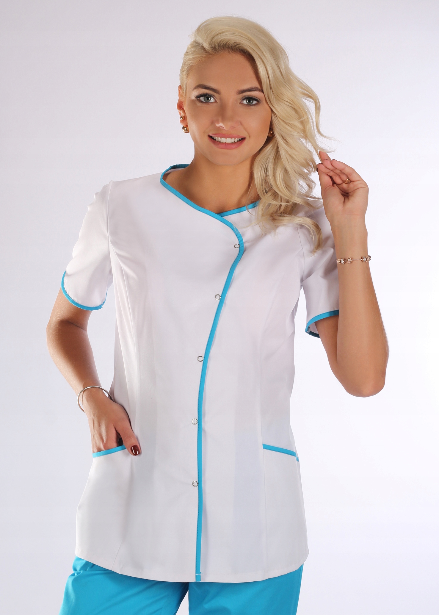 Куртка медична, медична та косметична на застібках, Schaeffer. Застібка передбачає два варіанти вирізу, французькі вирізи спереду формують силует. Можна поєднувати з брюками-сигаретами або класичними прямими брюками. Короткі рукави, дві кишені на рівні стегон (рекомендуємо тут розмістити логотип компанії або флок - для цього звертайтеся до виробника).