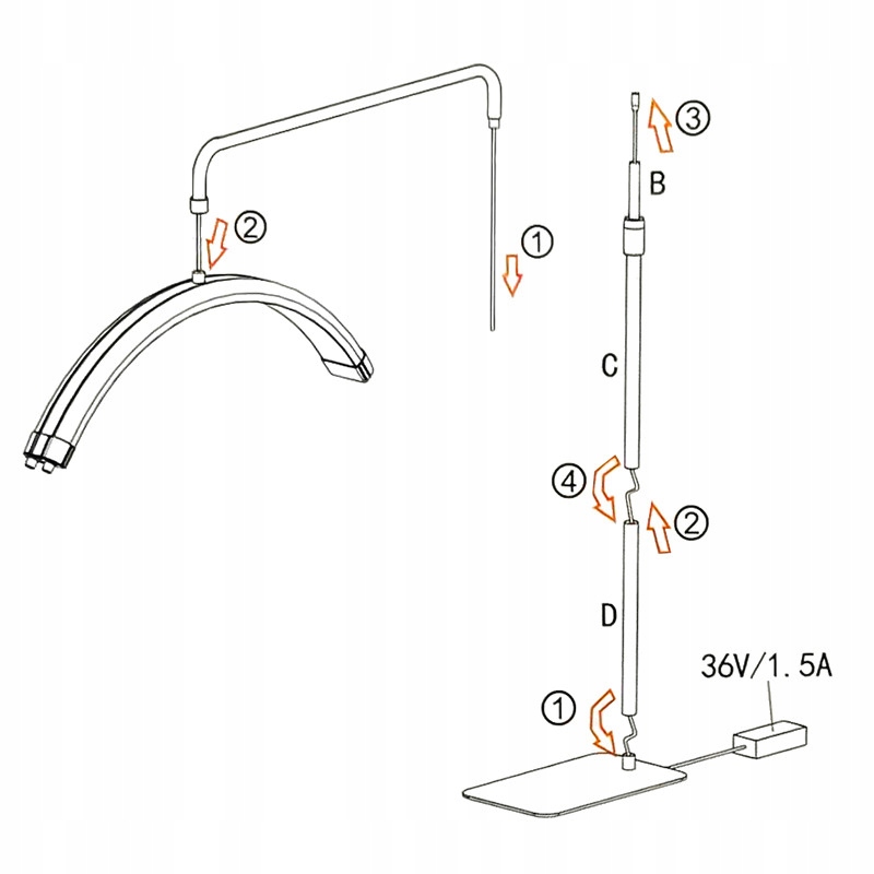 Головка лампи встановлена на спеціальному штативі, виготовленому з міцного алюмінію. Його можна обертати на 360°, що є додатковою зручністю під час роботи. Висота штатива регулюється і становить від 124 до 178 см. Підвішена на ньому світлова панель може розташовуватися на відстані від 110 до 163 см від землі, завдяки чому ми можемо легко пристосувати її положення до різних типів кушеток, ліжок або процедурних столів. Штатив також має тверду плоску основу з нековзкими ніжками. У комплект входить тримач для телефону, встановлений над головою лампи, і адаптер живлення.