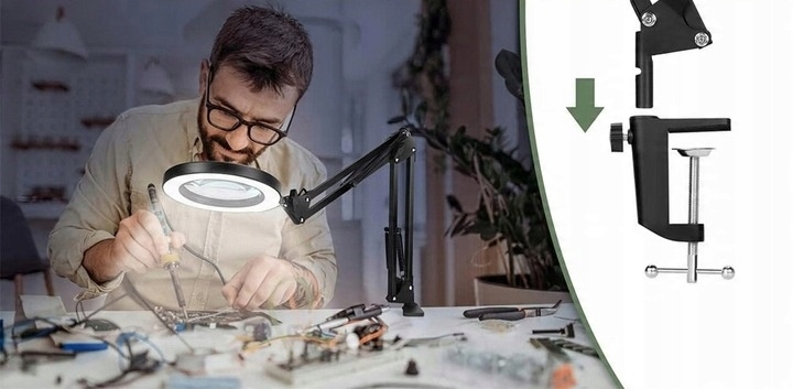 - Завдяки гнучкому поворотному кронштейну його можна вільно висувати, щоб надійно утримувати лупу, залишаючи ваші руки повністю вільними. The 360° rotatable lamp head can be adjusted to any angle to meet your needs.