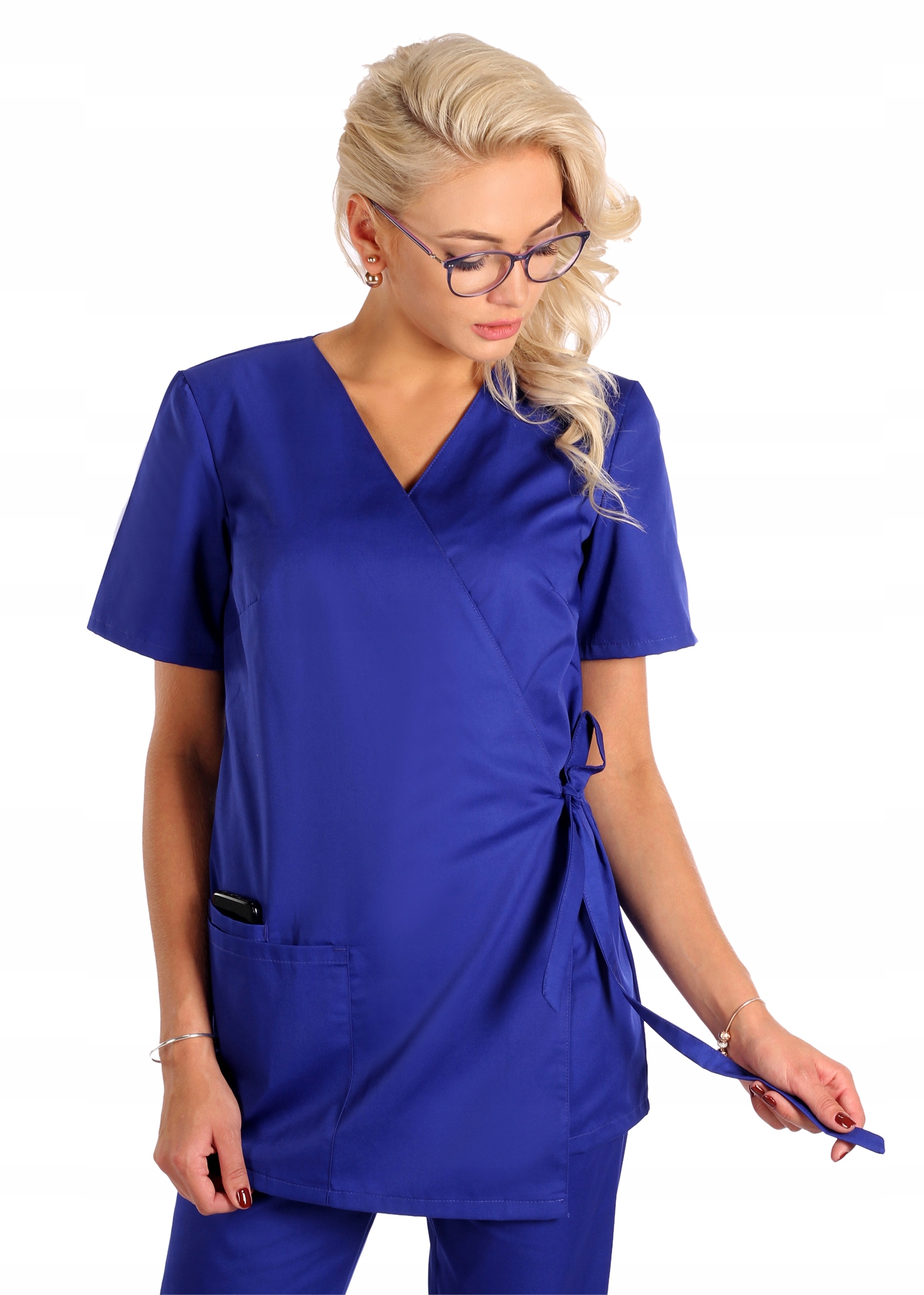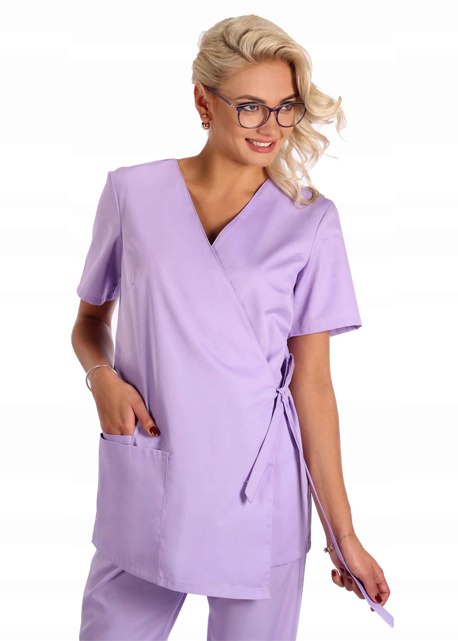 Медична, косметична толстовка, кімоно. Сторони, прив'язану з обох боків, дозволяють пристосуватися до фігури (звідси комбінований розмір). Трохи коси спереду, добре подовжують фігуру. Ця толстовка трохи довша, ніж класичні медичні толстовки, вона чудово працює з штанами сигарій, доступними на інших наших аукціонах. Короткий рукав, подвійний кишеню на правій висоті стегна (менші розміщує смартфон).