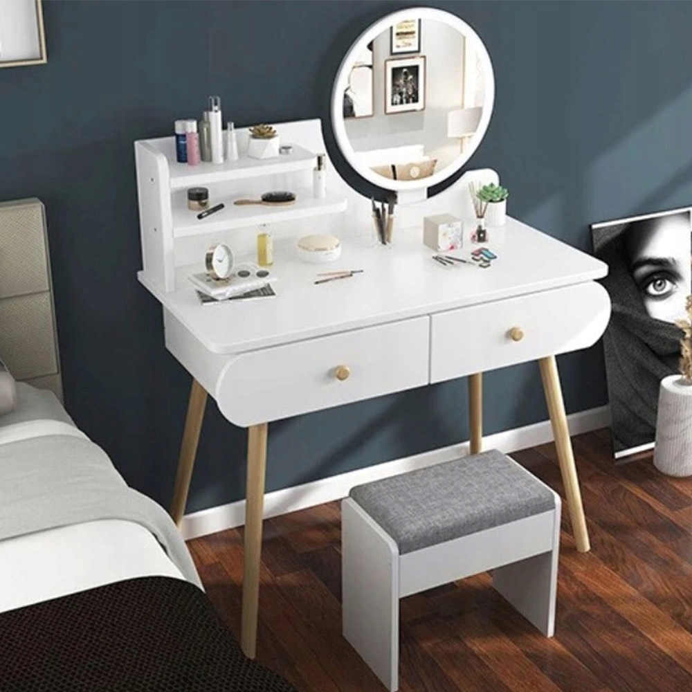 Туалетний столик — ідеальне місце для нанесення будь-якого макіяжу. Він оснащений висувними ящиками зі зручними ручками і полицями, які ідеально підходять для зберігання базової косметики або інструментів для макіяжу. Завдяки цьому підтримувати порядок на стільниці не складе труднощів, дозволяючи добре організувати простір і зберегти охайний вигляд туалетного столика.