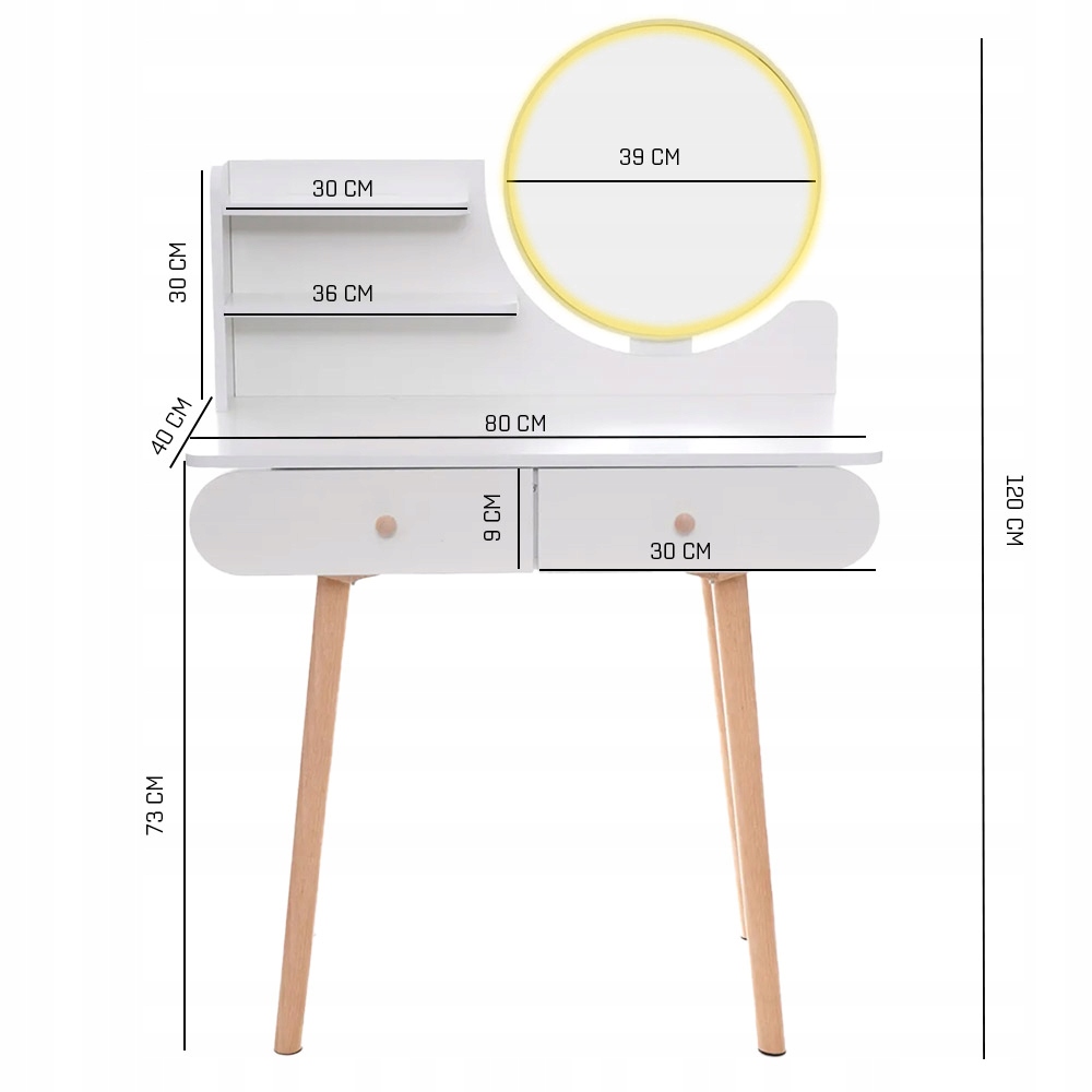 Косметичний туалетний столик KENDI - ідеальне доповнення до спальні кожної жінки. Елегантний скандинавський стиль зробить його ідеальним компаньйоном як для дорослих, так і для молодих жінок, які цікавляться нанесенням макіяжу. Макіяж здатний підкреслити природну красу, підкреслити риси обличчя та приховати недоліки, а також додає впевненості в собі - ось чому так важливо придбати обладнання, яке робить це заняття легшим і приємнішим. Туалетний столик відрізняється високою функціональністю - на ньому можна розмістити безліч косметичних засобів і аксесуарів для макіяжу як на стільниці, так і в ящиках і полицях. Велике дзеркало дозволить легко перевірити зовнішність з різних ракурсів. Додатковою перевагою меблів є світлодіодне підсвічування, яке дозволить наносити або знімати макіяж навіть вночі.