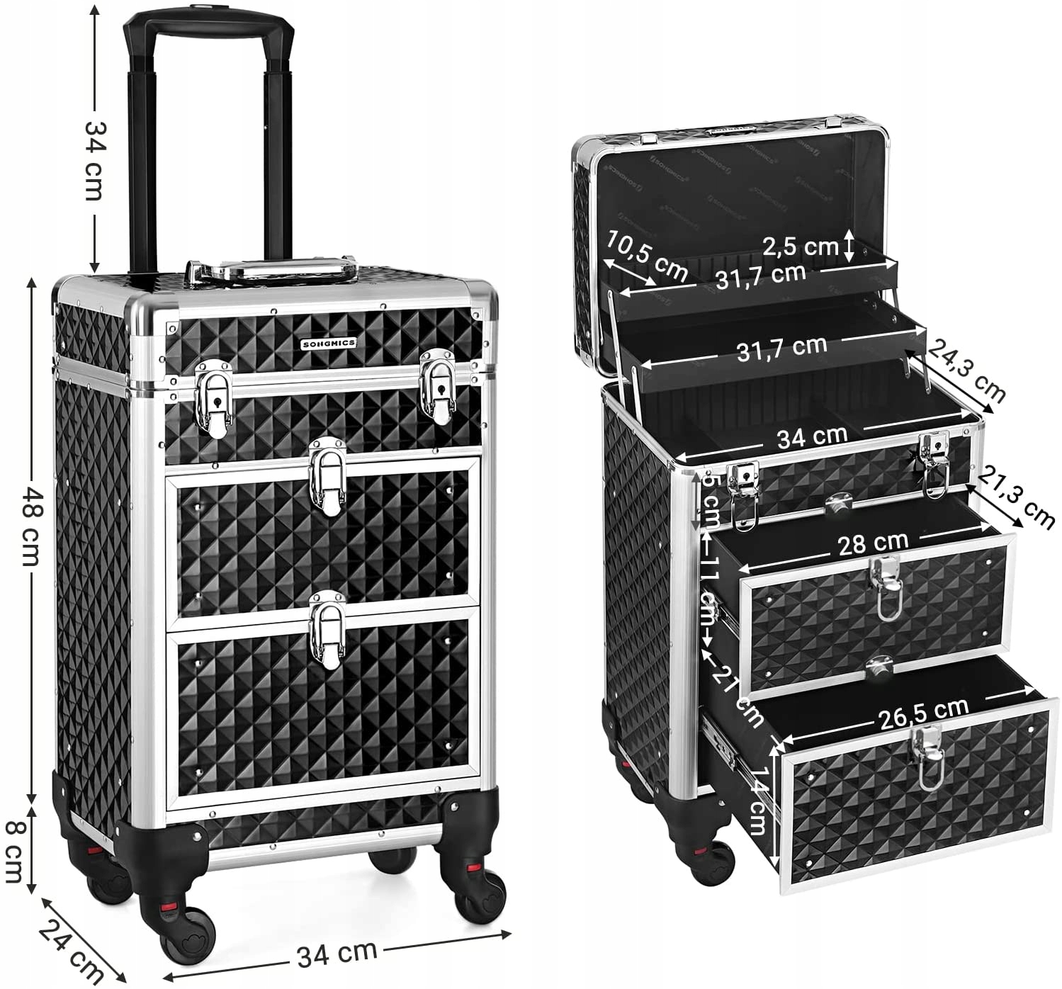 Легкий доступ та продуманий дизайн: при відкритті обкладинки замками верхні рівні відкриваються одночасно. Нижні ящики оснащені навісними засувками і їх можна легко витягнути, що полегшує доступ до зберігаються предметів. Завдяки цьому організація та доступ до косметики стають надзвичайно простими та зручними. 4 Підсилений алюмінієвою рамою та пластиком у нижніх кутах, стійким до шоку та еластичної (до 10 кг); Телескопічна ручка, посилена закриттям липучки, стабільною та довговічною. Ви можете бути впевнені, що цей багажник буде служити вам протягом багатьох років, зберігаючи бездоганний вигляд.