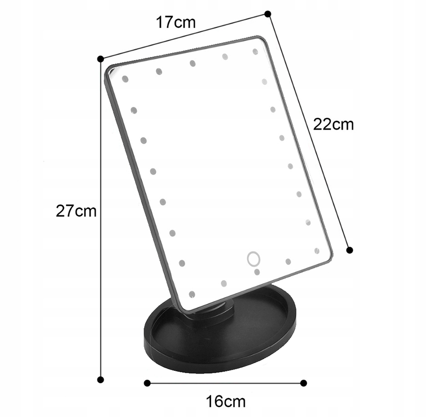 Це ідеальна пропозиція для всіх, кому потрібно швидко та в ідеальних умовах наносити макіяж. ! Підходить як для домашнього використання, так і під час фотосесій. Легкий і складаний, він підійде для будь-якої ванної кімнати, спальні або фотостудії. Завдяки 22 ефективним світлодіодним індикаторам, які живляться від батарейок типу АА або через порт microUSB (кабель у комплекті), його можна використовувати майже будь-де, навіть у темній кімнаті!