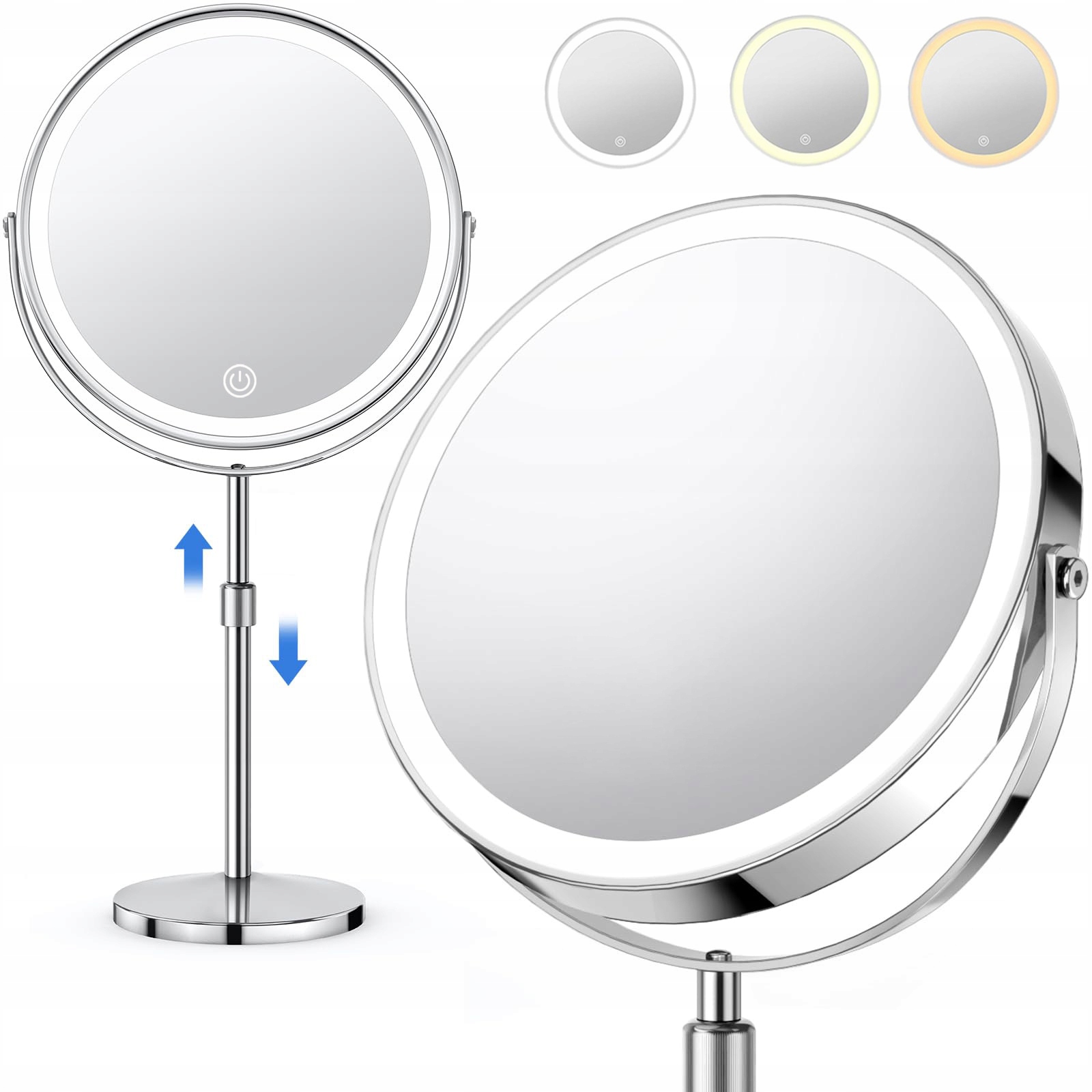 1 x 8-дюймове косметичне дзеркало з акумулятором Акумулятор і 10-кратне збільшення, 3 кольори, регулювання затемнення та висоти - сріблястий