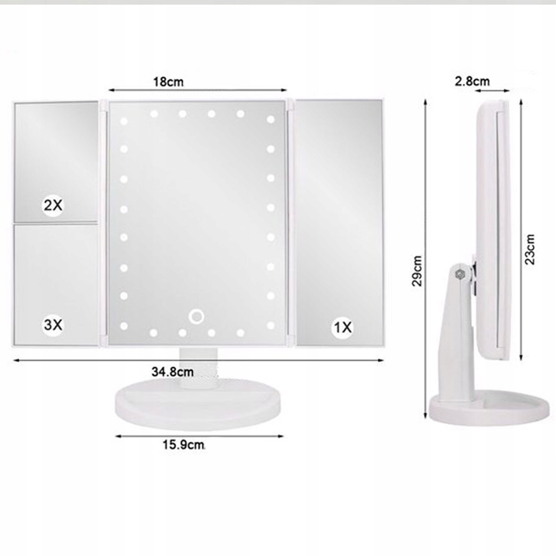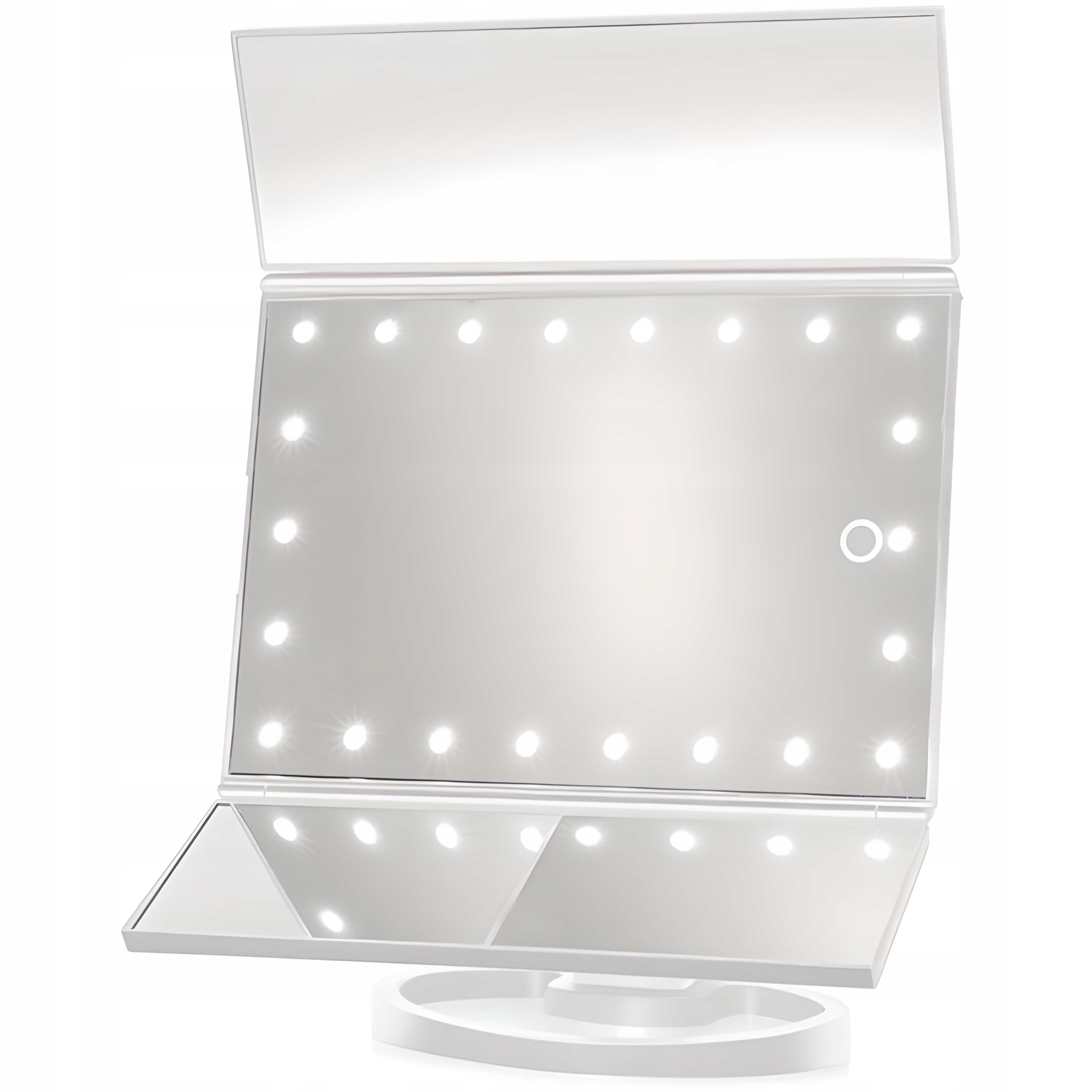 ✨ 3-компонентне дзеркало ✨ 22 світлодіоди ✨ Сенсорне керування ✨ 2x / 3x збільшення ✨ Функція обертання на 180° та 90°✨ Стійка основа з органайзер ✨ Живлення від батарейок AA ✨ Ідеальний подарунок для кожної жінки ✨ Ідеальний для макіяжу та догляду ✨