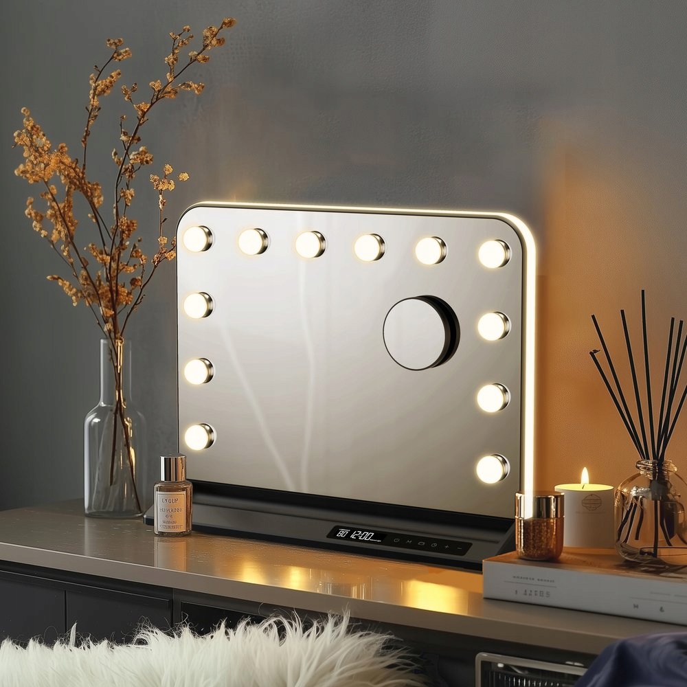 Косметичне дзеркало зі світлодіодним підсвічуванням, РК-дисплеєм, годинником-органайзером з USB-A USB-C