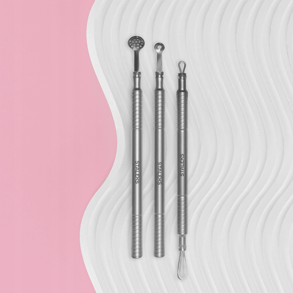 Набір Staleks Beauty & Care Pure Skin Set призначений для домашнього використання. У набір входять три інструменти: ложка Uno, мірна ложка і двостороння косметична петля. Інструменти в наборі Staleks Beauty & Care виготовлені з високоякісної медичної сталі, мають поліровані краї для зниження ризику травм шкіри та спеціальні насічки на ручках для зручності використання.