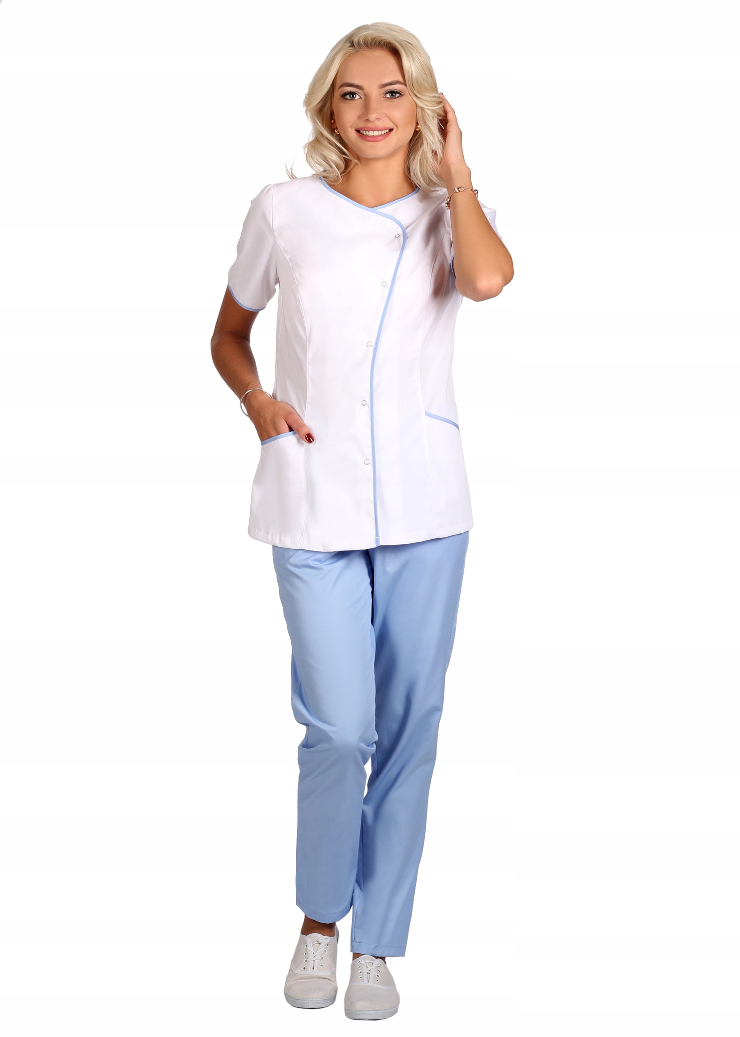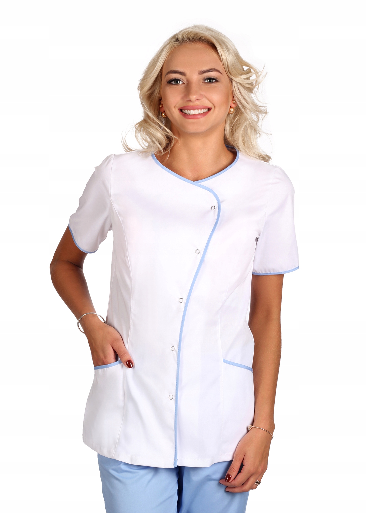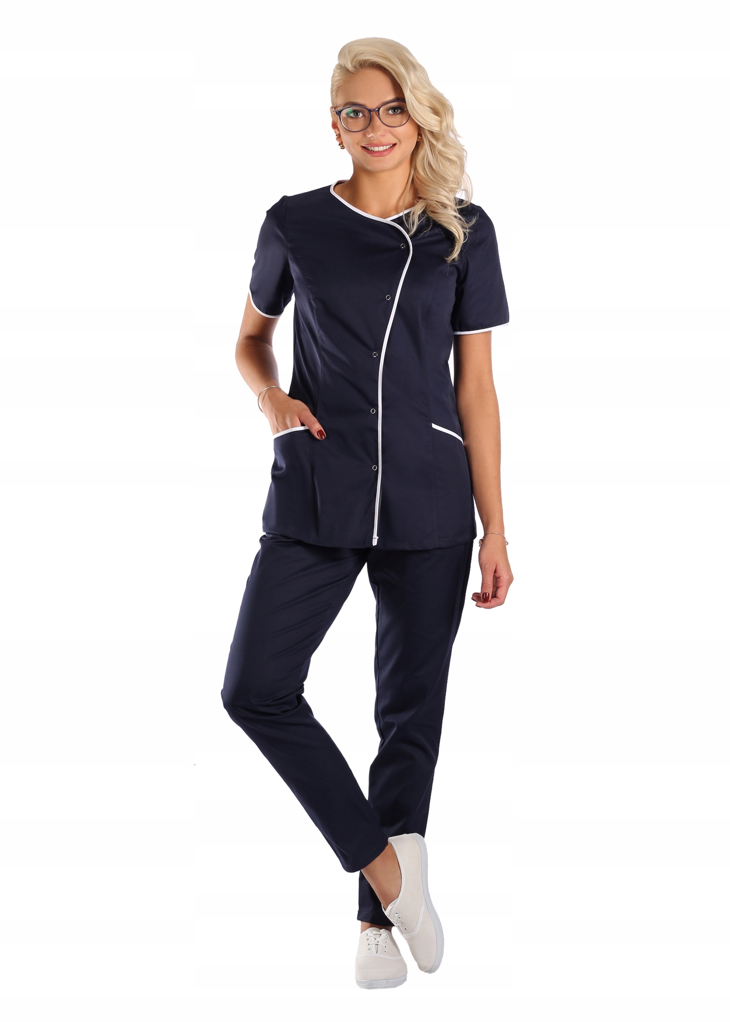 Куртка медична, медична та косметологічна Schaeffer на кнопках. Застібка передбачає два варіанти вирізу. Французькі вирізи спереду формують силует. Можна поєднувати з брюками-сигаретами або класичними прямими брюками. Короткі рукави, дві кишені на висоті стегон (рекомендуємо тут розмістити логотип компанії або флок - для цього звертайтеся до виробника).