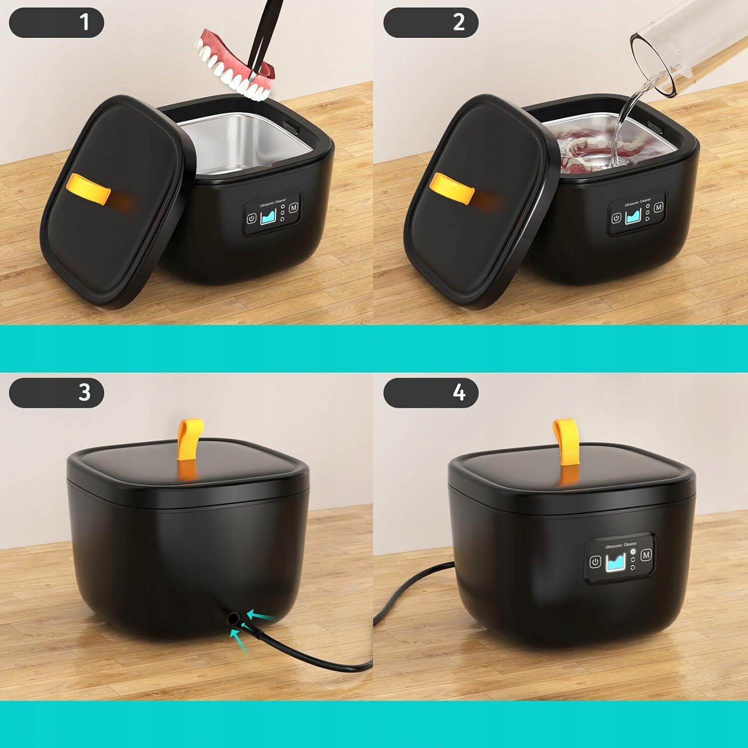 Пристрій для очищення ортодонтичних приладів використовує ультразвукові хвилі з частотою 42-45 кГц, які навіть проходять у крові та ефективно вилучити мотол. Прилади, накладки, відбілюючі накладки, захисники зубів, зубні щітки і навіть прикраси. У поєднанні з УФ -випромінюванням він дає променисті та гігієнічні результати.