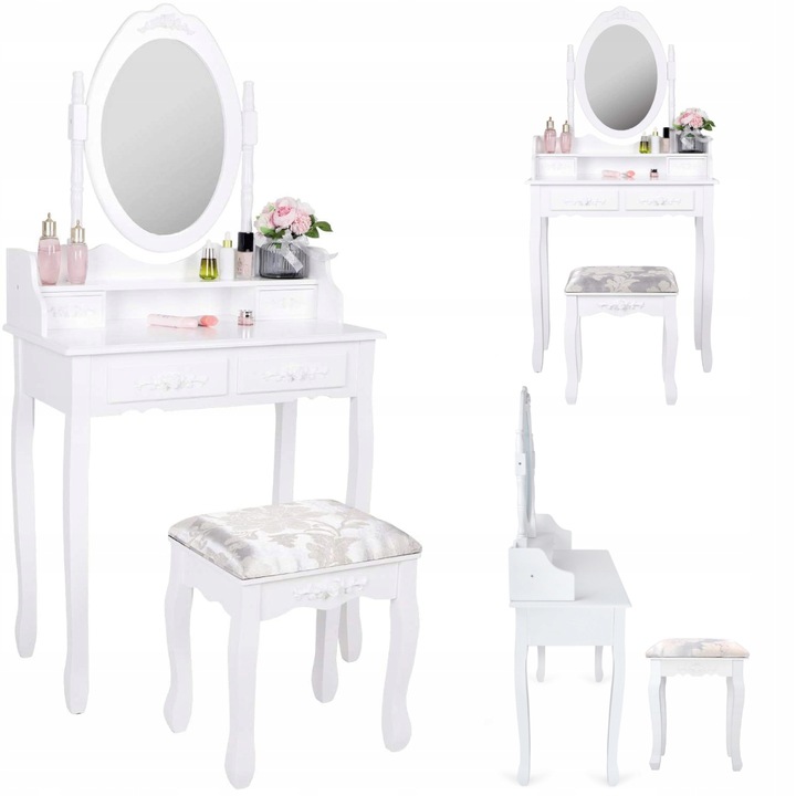 Туалетний столик виконаний в універсальному стилі, завдяки чому він чудово вписується як в сучасний, так і в класичний інтер'єр. Туалетний столик виконаний в мінімалістичному стилі, покритий білою, матовою фарбою. Давши волю своїй уяві, ми можемо прикрасити його відповідно до власних уподобань.