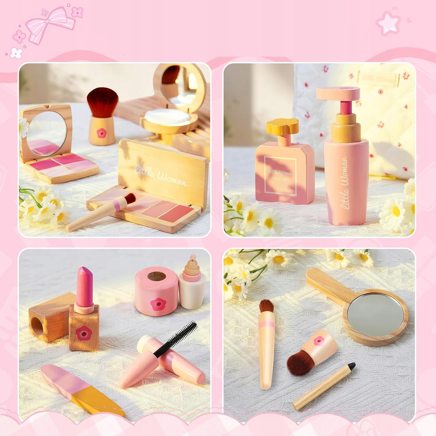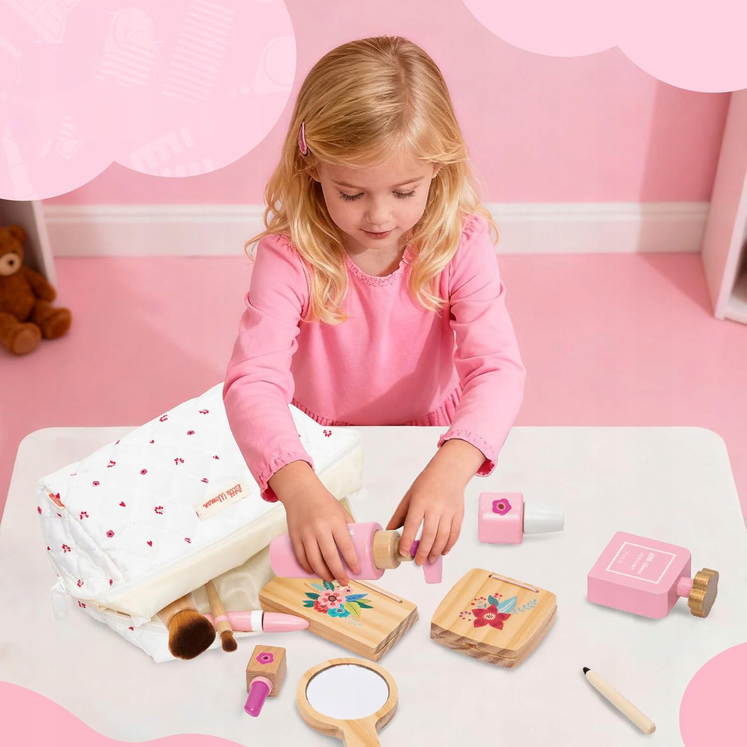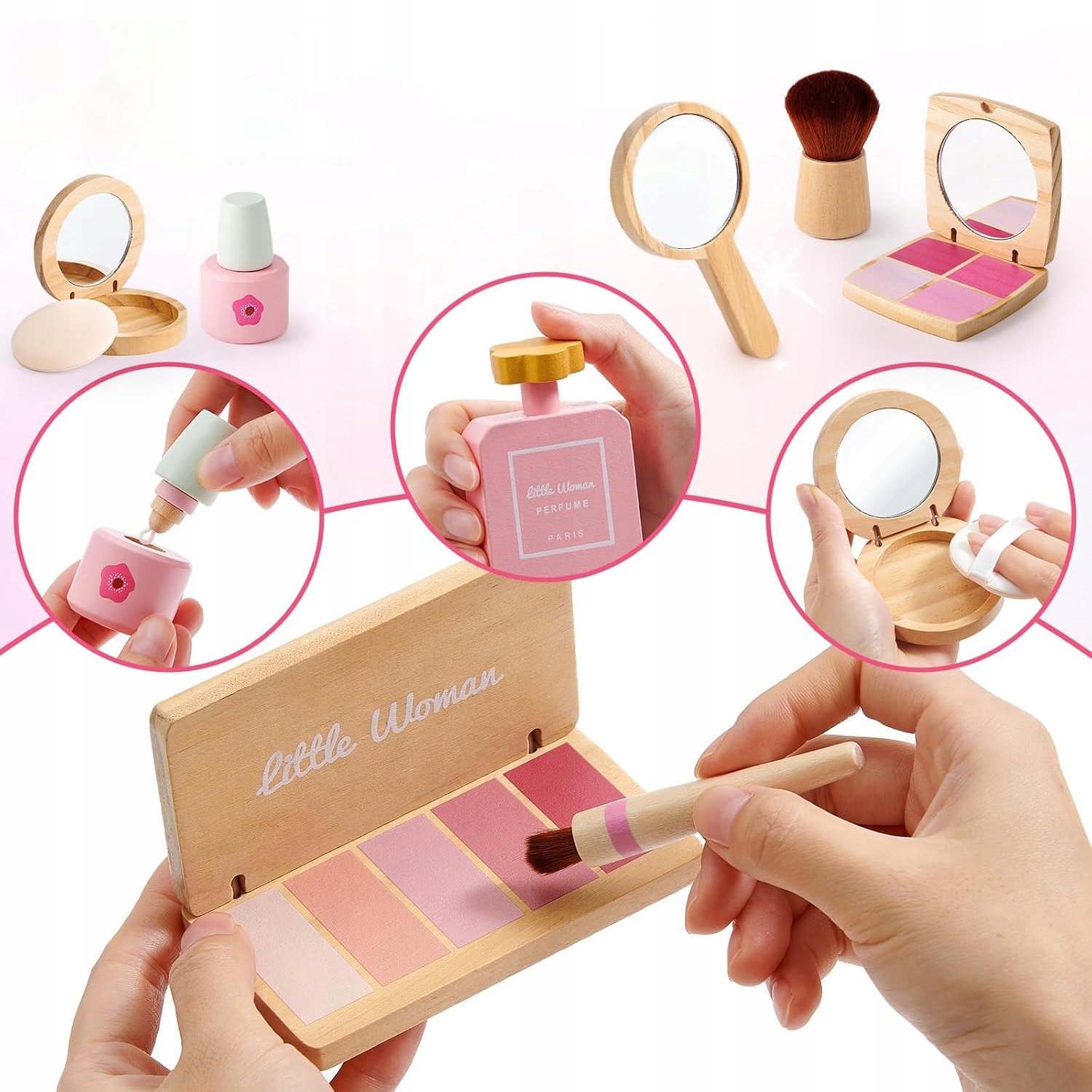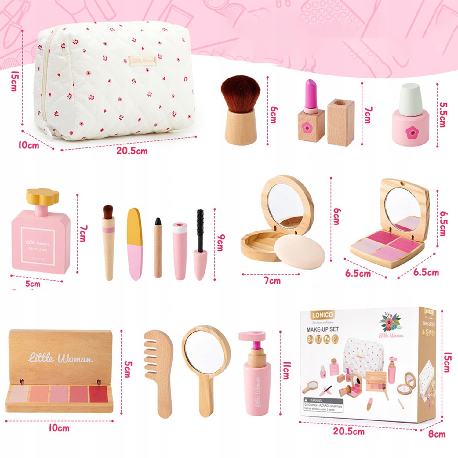 Цей красивий і практичний дерев'яний набір макіяжу перетворить кожну дівчину на принцесу. Містить усі необхідні аксесуари для макіяжу для дівчинки: м'яка косметичка, бальзам, олівець для брів, пудра, палетка тіней, пензлик для тіней, палетка рум'ян, пензлик для рум'ян, туш для вій і пензлик, помада, духи, лак для нігтів, пилочка, гребінець і дзеркало. Ці аксесуари збагатять макіяж вашої дитини та стимулюватимуть її уяву.