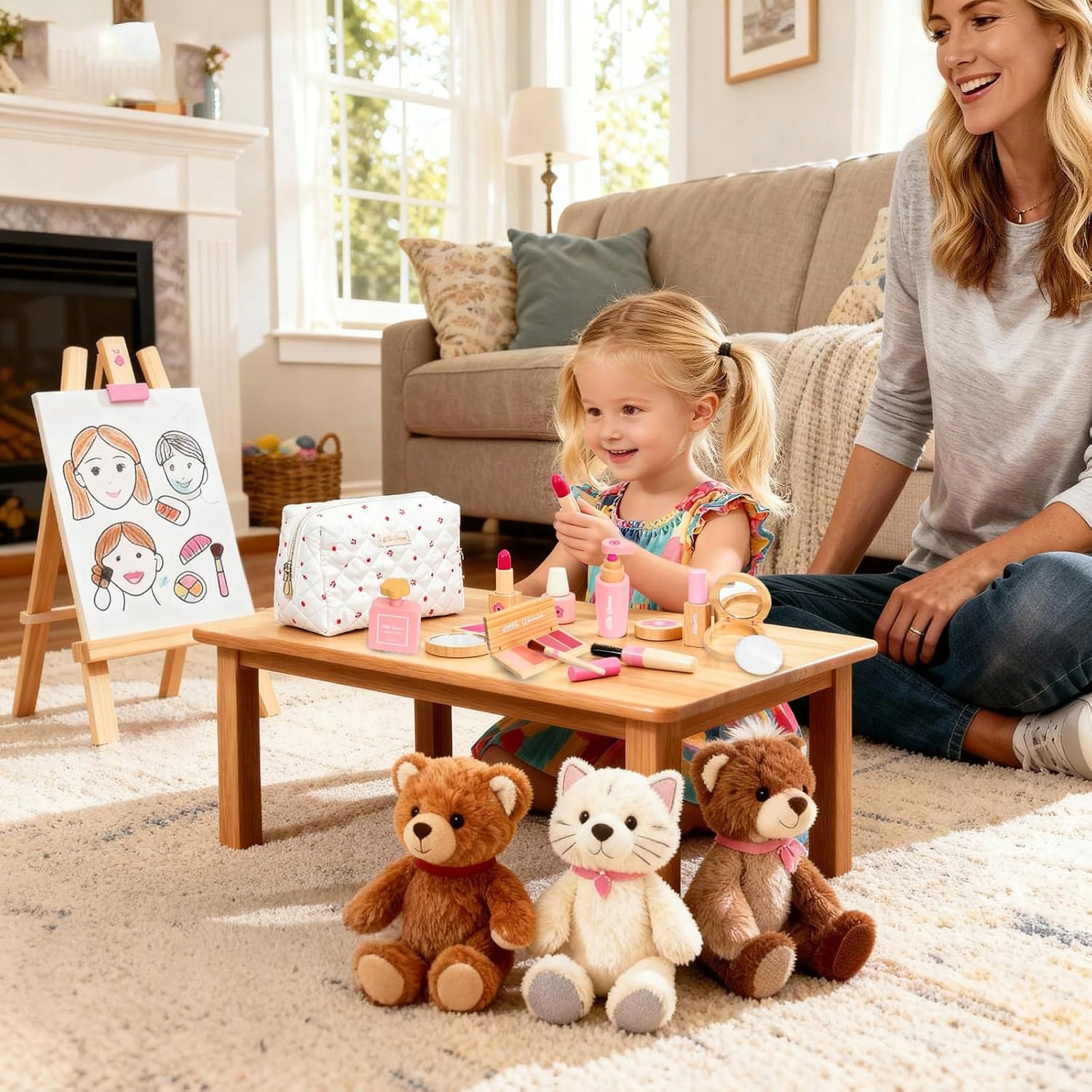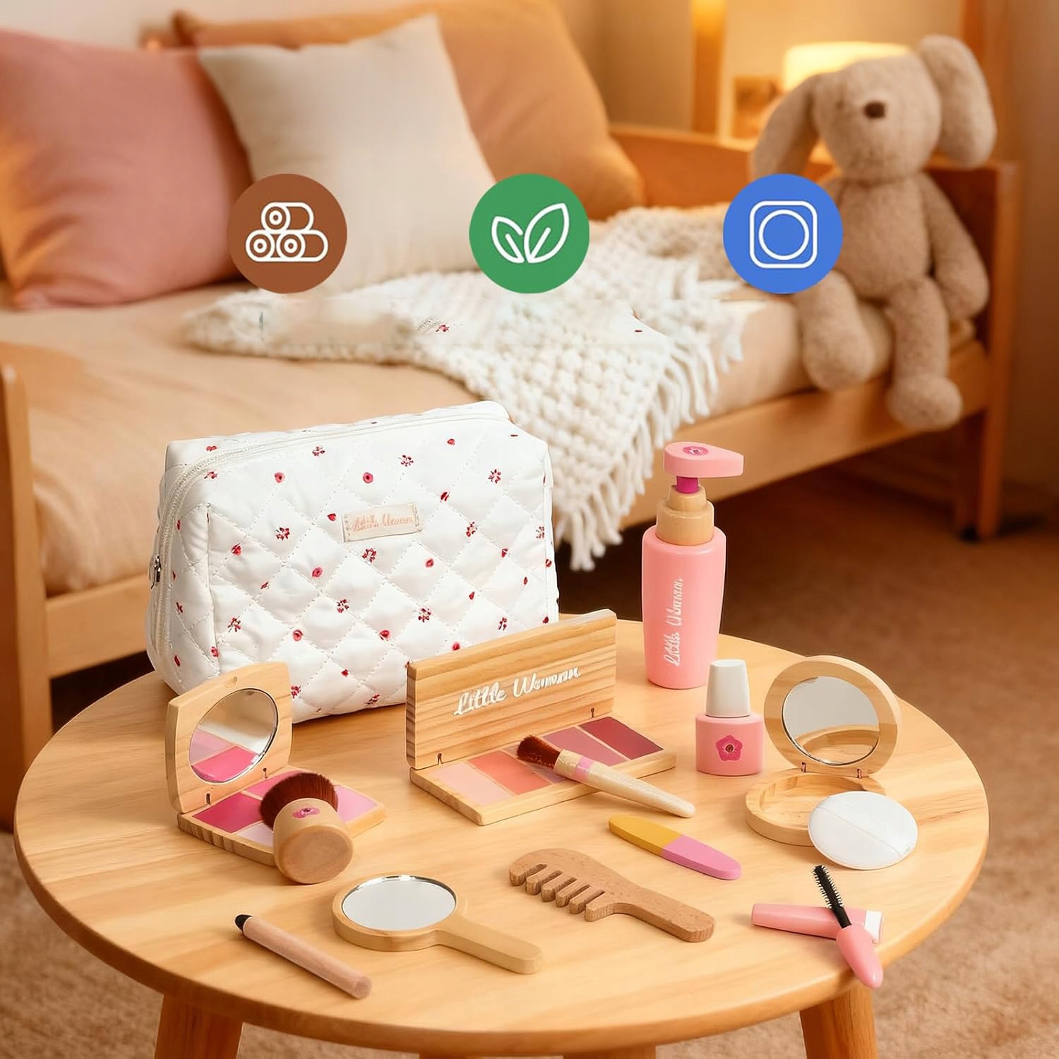 Наші вироби ретельно виготовлені з твердої деревини, характеризуються гладкою полірованою поверхнею та нетоксичною, екологічною фарбою на водній основі без запаху. Наші дерев’яні набори для макіяжу не тільки дозволяють дітям відчути радість імітації макіяжу, але й запобігають плямам і пошкодженням ніжної шкіри, забезпечуючи безпечне середовище для вашої дитини.