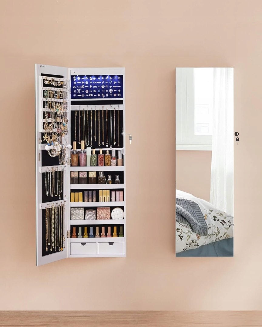 підвісна шафа з дзеркалом для ювелірних виробів, годинників, аксесуарів, білих