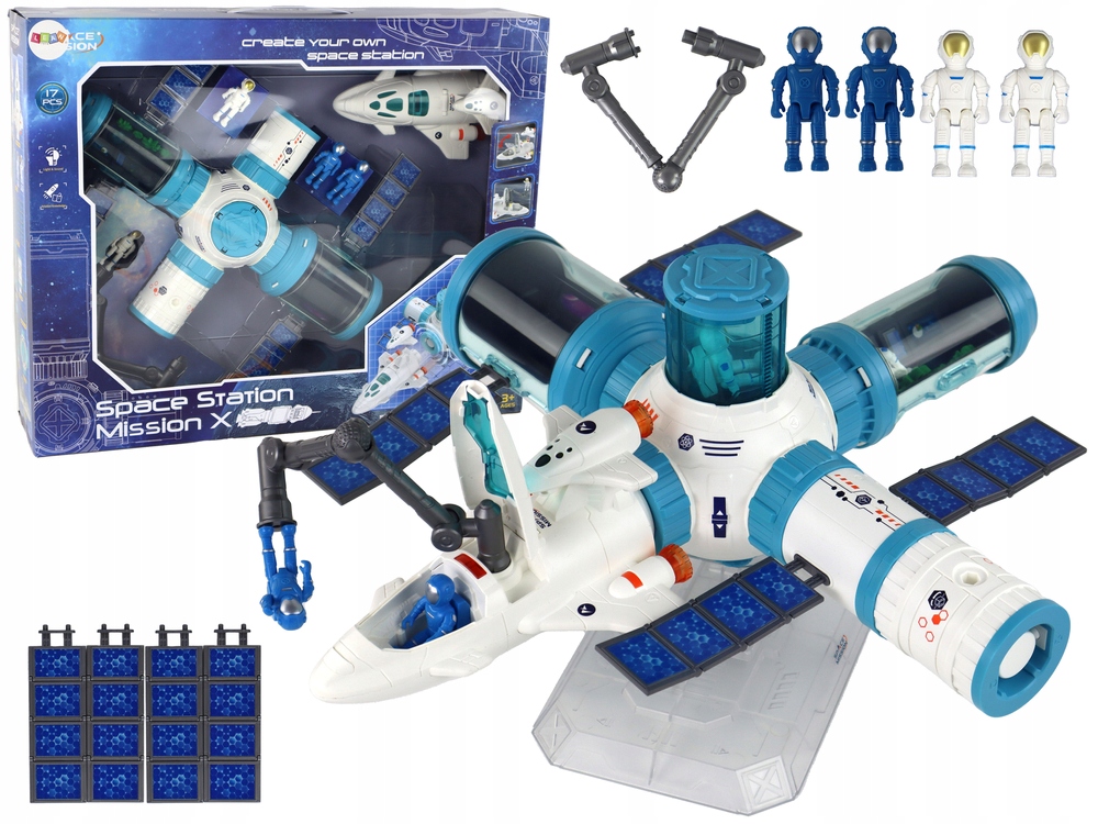 - Космічна база Це центральна частина набору, яка є відправною точкою для космічних місій. Це основне місце, де космонавти планують свої дії.Вантажний модуль вміщує різні види вантажів, які космонавти перевозять у космос.Набір містить трьох космонавтів у спеціальних скафандрах, які відправляються в космічні місії. Дрон використовується для дослідження віддалених районів космосу та збору даних.Сонячні батареї - це елементи, які забезпечують енергією різні пристрої в комплекті, забезпечуючи енергією космічний човник та інші модулі.Завдяки космічній руці астронавт може виконувати різноманітну роботу у космосі, як-от ремонт чи збір зразків.