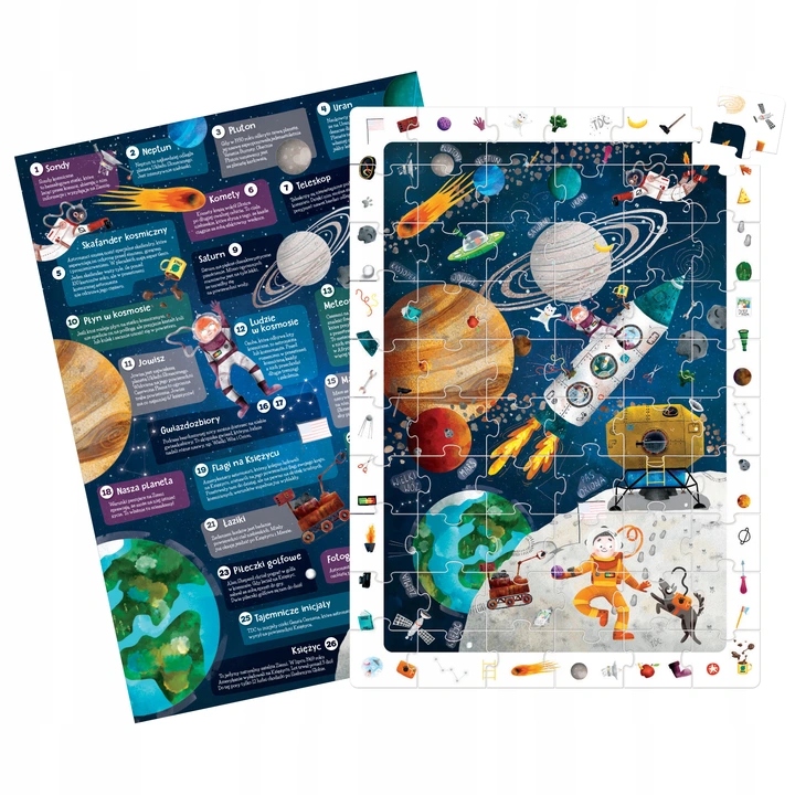 Космос чекає на своїх дослідників! Розвиваючий пазл на 60 елементів дозволяє ближче розглянути Сонячну систему. Ми розмістили багато деталей на рамці головоломки, щоб шукати на ілюстрації, щоб розвага тривала ще довше. У набір входить постер із космічними цікавинками.