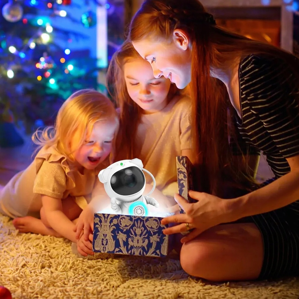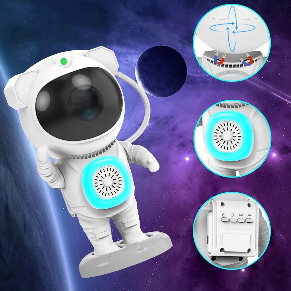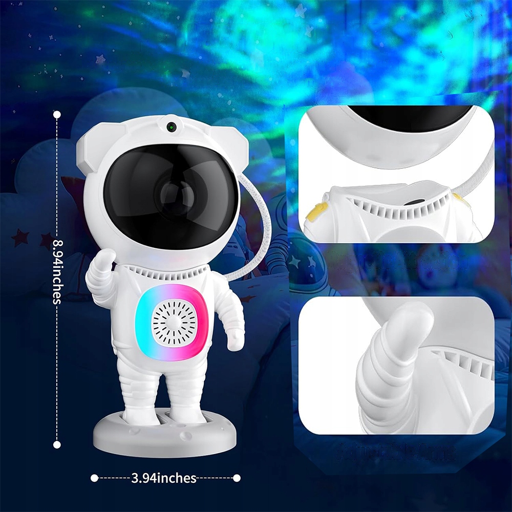 Проектор для спальні у формі астронавта також поєднує в собі функцію різнокольорової нічної лампи. Скриня фігурки може підсвічуватися 7 кольорами: червоним, зеленим, синім, жовтим, фіолетовим, рожевим і білим, з підтримкою одного кольору або циклу кольорів. Голова астронавта може проектувати 7 кольорів туманностей, а також покривати всю спальню світлом зірок. Пульт дистанційного керування дозволяє керувати всіма режимами, не встаючи з ліжка, ви можете перемикатися між режимами улюбленої туманності та нічного освітлення, дозволяючи зірковому світлу та світлу супроводжувати вас у солодких снах.