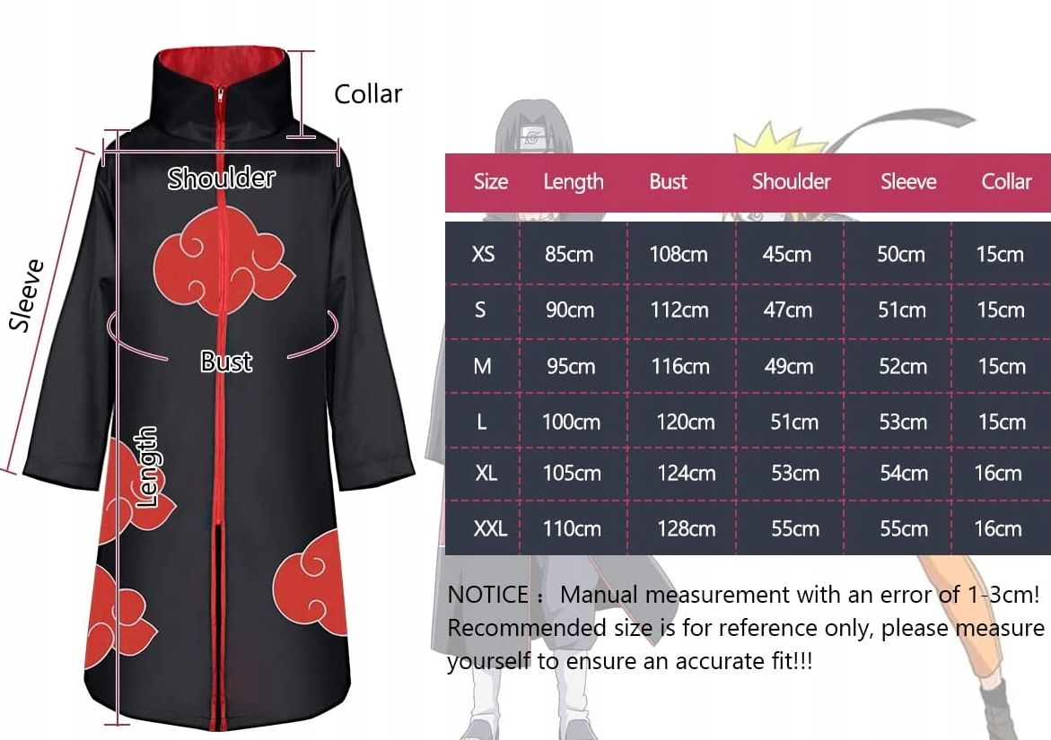 Костюм накидки Акацукі зроблено зі 100 % волокна поліестер, приємний у носінні та має високоякісну обробку. вишивка, вдосконалена технологія візерунків, яка робить колір більш яскравим, а поділ добре зшитий і правильний.