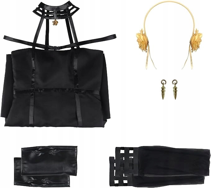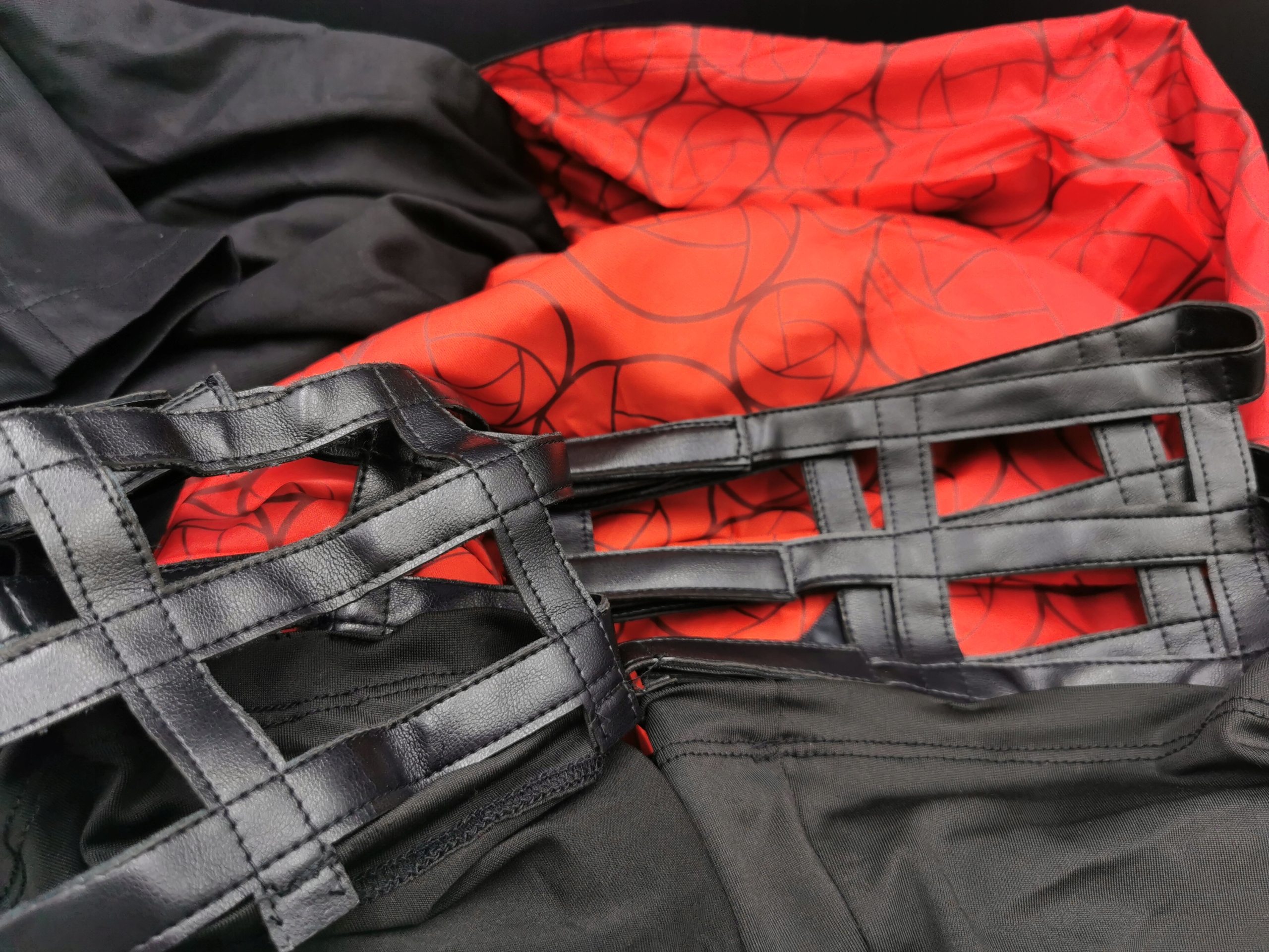 - Найважливіші особливості дизайну - головний убір із золотими квітами, металеве декоративне намисто, регульовані лямки на спині, червоний квітковий принт на внутрішній край, шкіряні рукавички. Просто одягнись і стань прекрасним «убивцею»!
