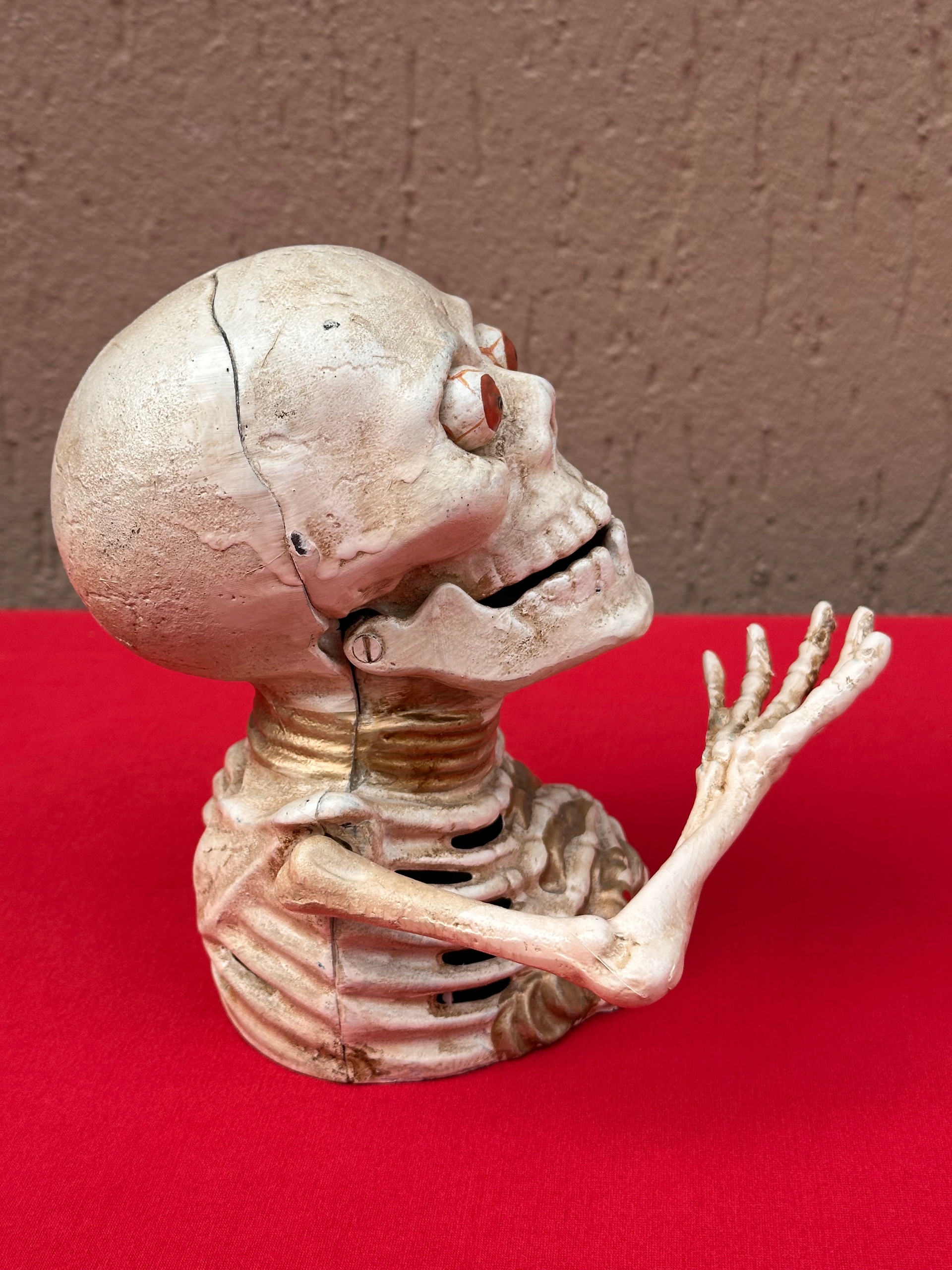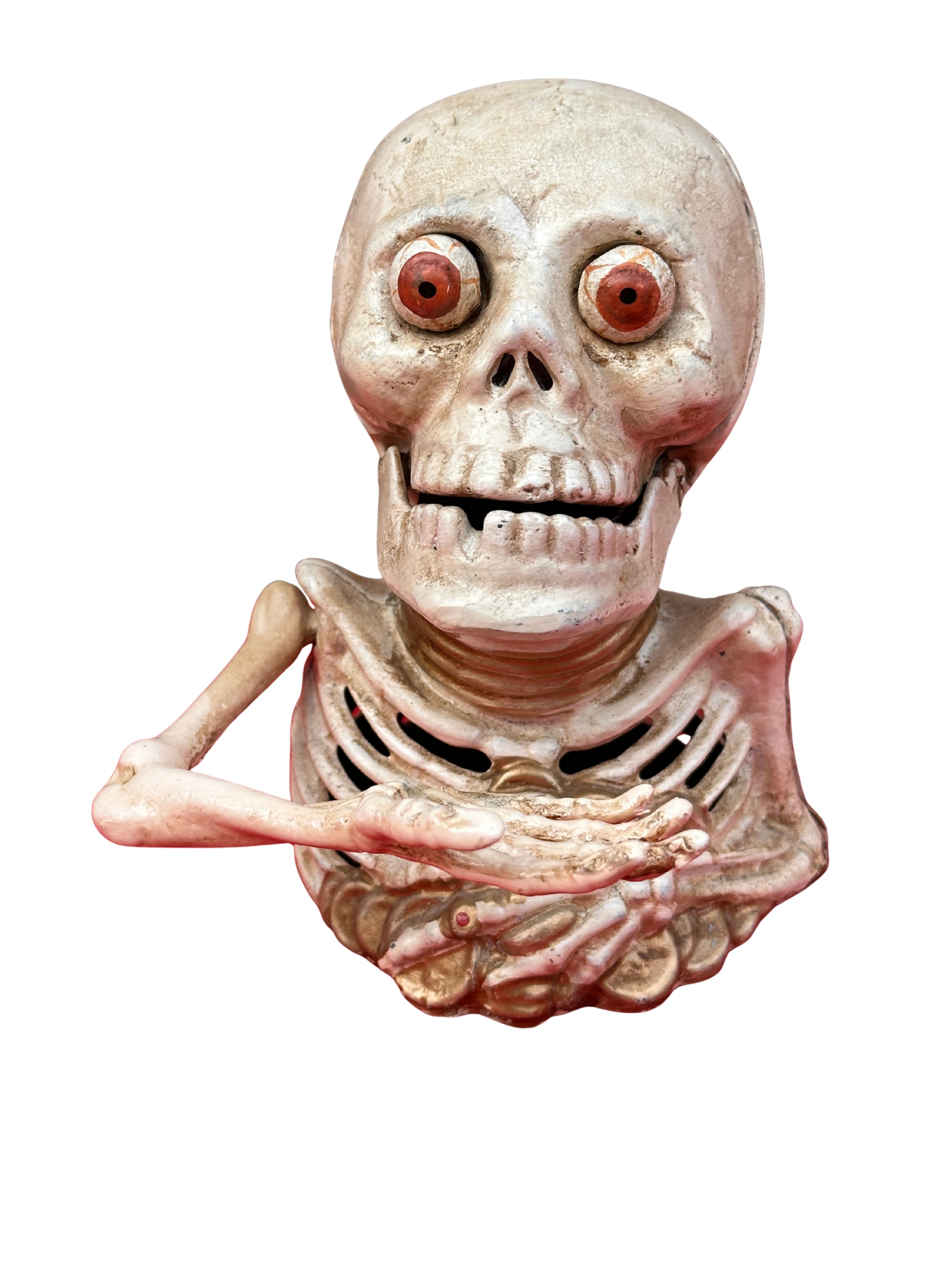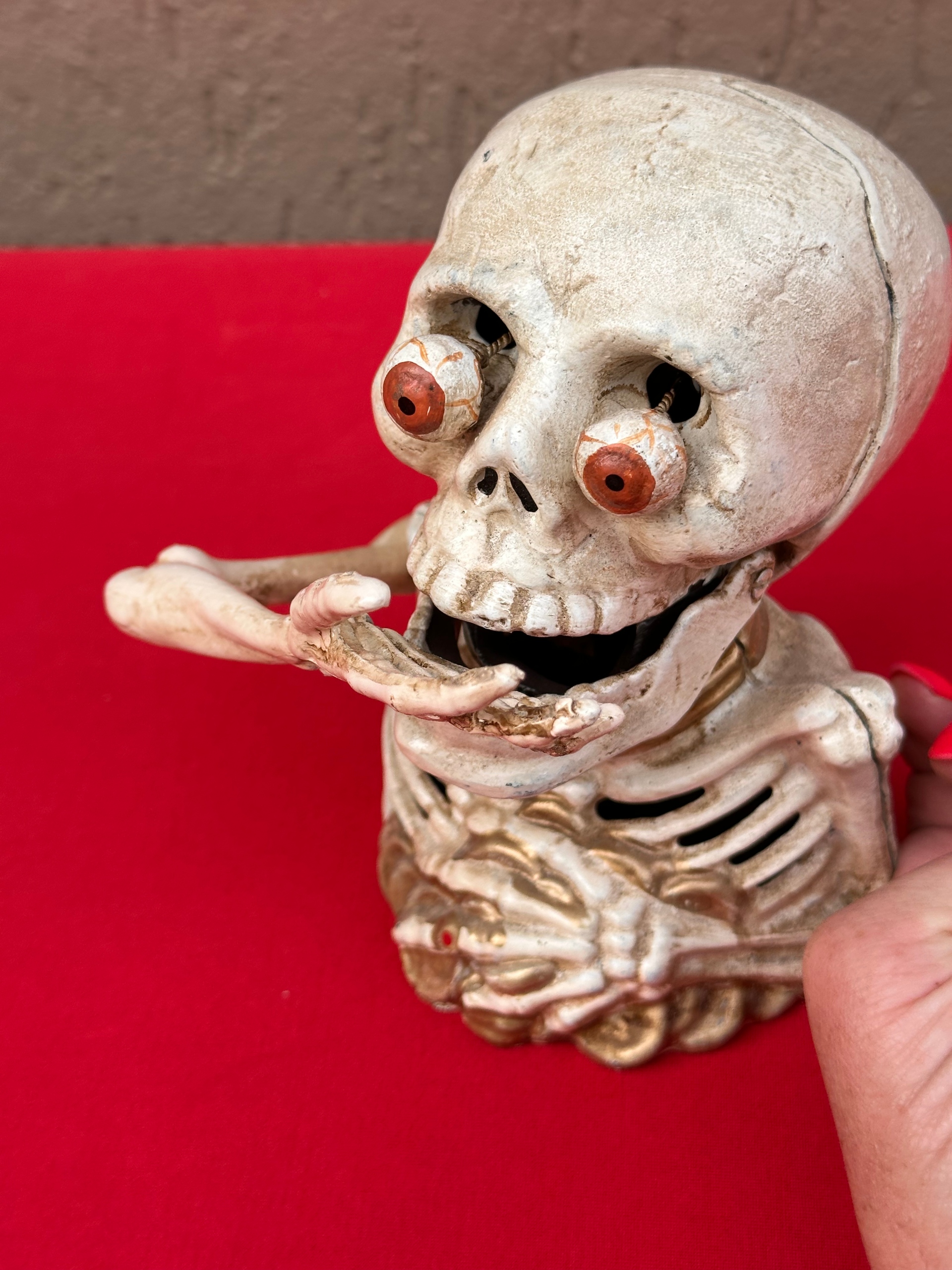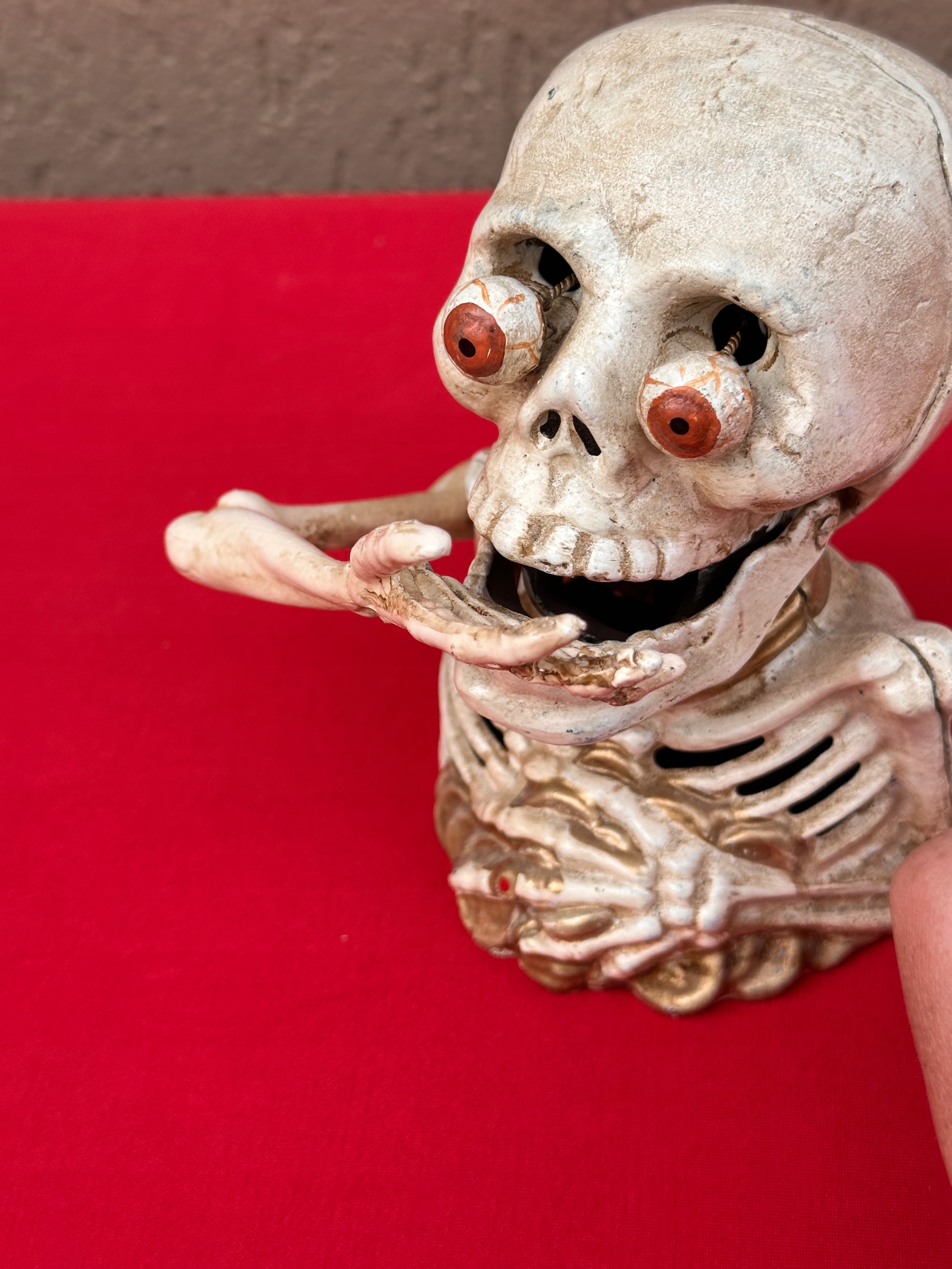 Скелет кидається монетами до рота, піднімаючи руку, натискаючи на важіль ззаду фігурки.