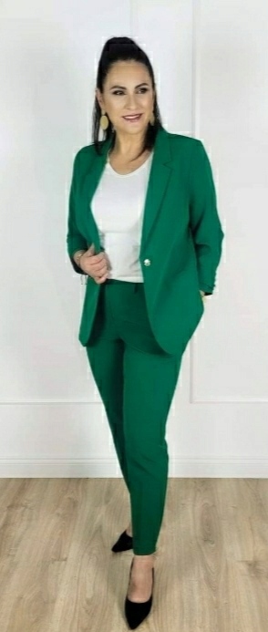 піджаків на підкладці, 3/4 рукава, закінченого декоративним елементом і 2 кнопками, пришитими до рукава, до цікавої манжети- ви можете бачити фотографії ближче, красиві флапси, що вирізають чудово, це чудово. Фініш рукава можна побачити точно на фотографії деталей деталей. Штани cyg "7/8 (багато залежить від висоти), на краю, на ремені, кріпленому кнопкою. Хіт -модель - справді чудовий набір.