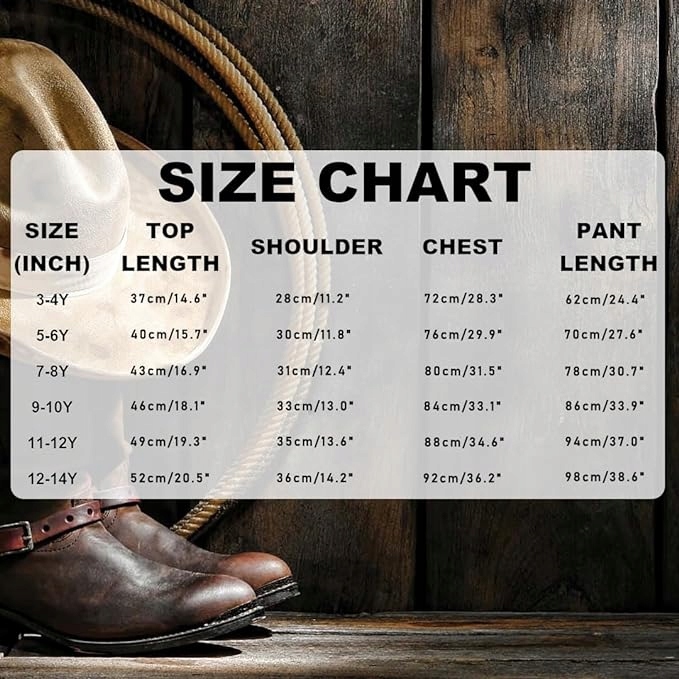 - Точний розмір для ідеальної посадки: переконайтеся, що ваш маленький ковбой готовий до роботи за допомогою таблиці розмірів.