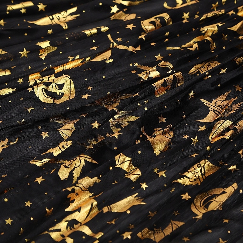 Накидка виконана з легкого, блискучого чорного матеріалу, прикрашена золотими мотивами Хеллоуїна. Він підходить кожному маленькому адепту магії, забезпечуючи зручність носіння та свободу рухів.