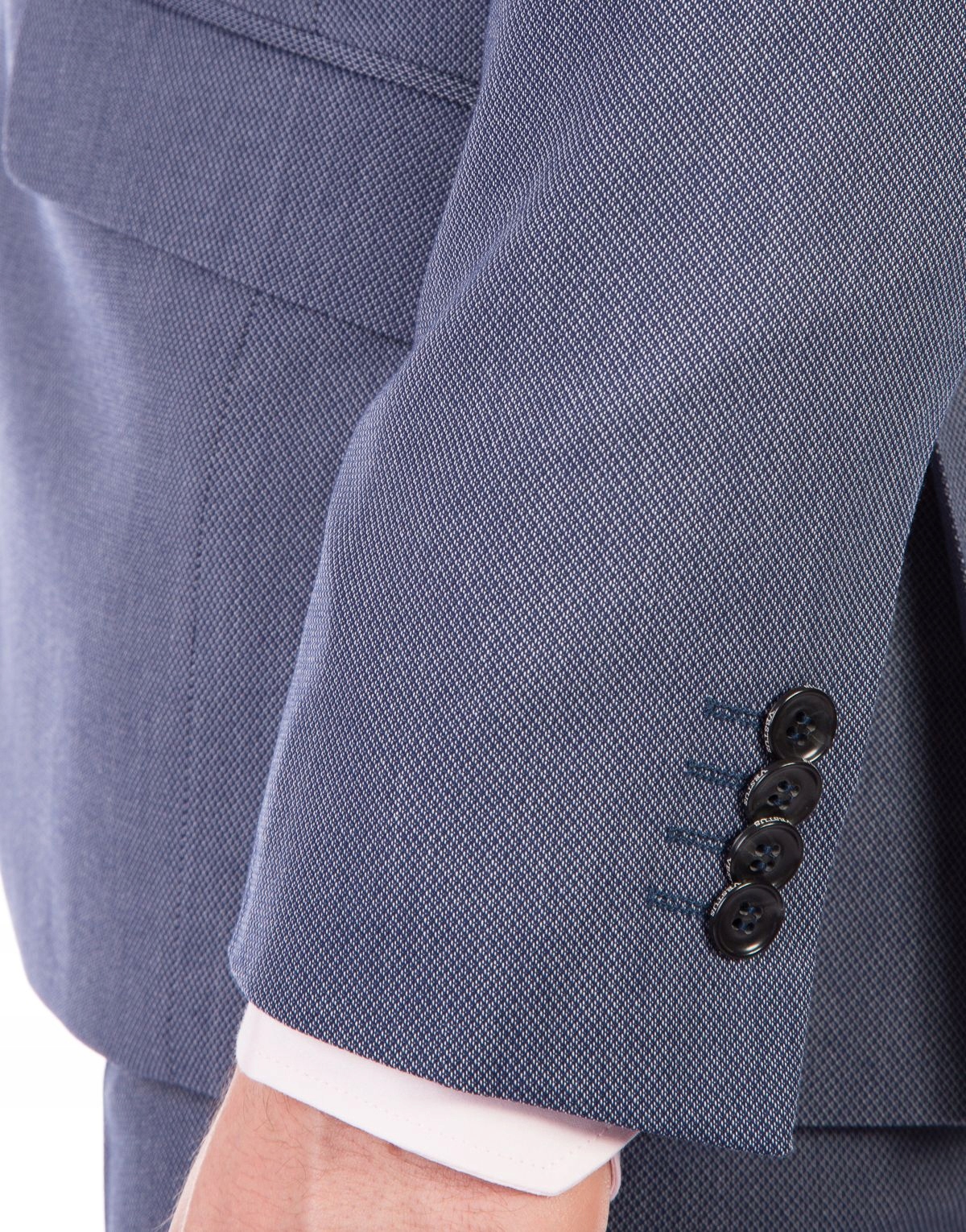Піджак застібається на два ґудзики з прямими лацканами, розрізом на грудях та двома швами.