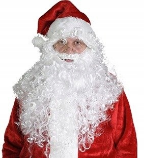 Перука виготовлена з дуже якісної синтетичної щетини, що імітує шовк. Волосся Діда Мороза густе і дуже довге, спадає йому на тулуб. Її вигляд природний, волосся укладене в ніжні кучері. Саме за бороду смикають більшість дітей, коли сидять на колінах у Діда Мороза. На щастя, наша борода має міцну гумку, яка утримує її на місці. Ми простягаємо гумку через вуха і закриваємо все це перукою та капелюхом.
