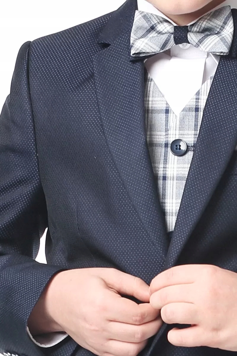 Однією з найчастіше вибраних моделей серед нашої багатої пропозиції є елегантний костюм хлопчика під назвою Enzo, ідеально підходить для святкування Першого Святого Причастя. Він виготовлений з конструкційної цукрової тканини і злегка блискучого в модному темно -синьому кольорі. Крім того, набір включає модний жилет решітки. Дуже елегантний, святковий, святковий та веселий набір. Куртка має дві живці ззаду, вона кріпиться двома кнопками, вона має дві нижні кишені з клаптями та грудною кишені (Брузе). Штани мають зручне та практичне регулювання окружності пояса (кнопки та еластики на внутрішній стороні пояса). Штани мають великий запас на дні ноги (довжина штанів), тому вони також можуть служити протягом року на річницю першого причастя або для інших випадків.