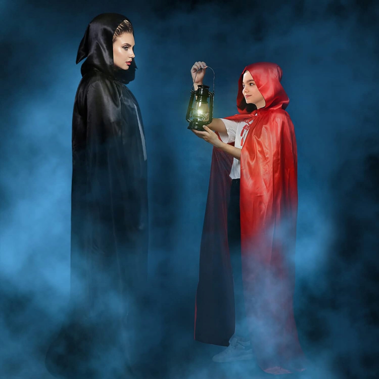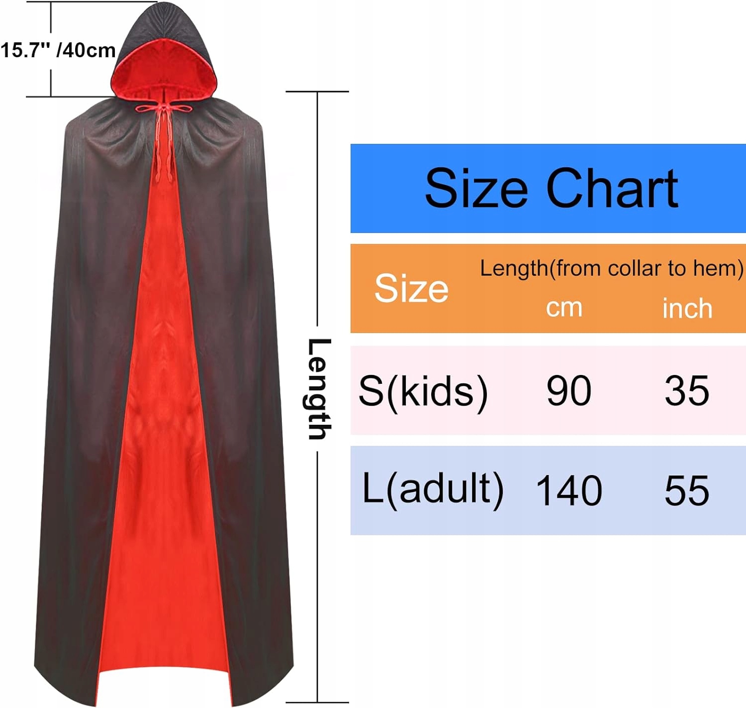 - Плащ вампіра з капюшоном має застібку на шнурівці та дизайн капелюха. Капелюх на накидці дуже великий і вільний, підходить на більшість окружностей голови. Мотузка на накидці ефективно утримує накидку і її не здує.