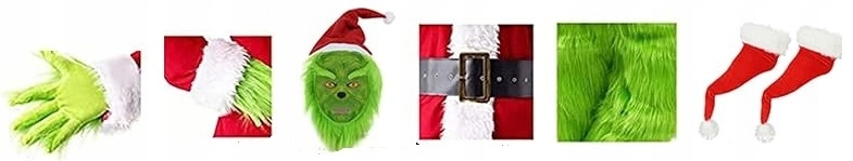 У набір входять хутряні штани та латексна маска Грінча, яка зробить персонажа більш реалістичним, з характерною посмішкою та деталями обличчя. Волохаті рукавички з м'якою флісовою внутрішньою частиною для більшого комфорту при носінні. Все це доповнюється сумкою Grinch - ідеальною для подарунків або для їх крадіжки.