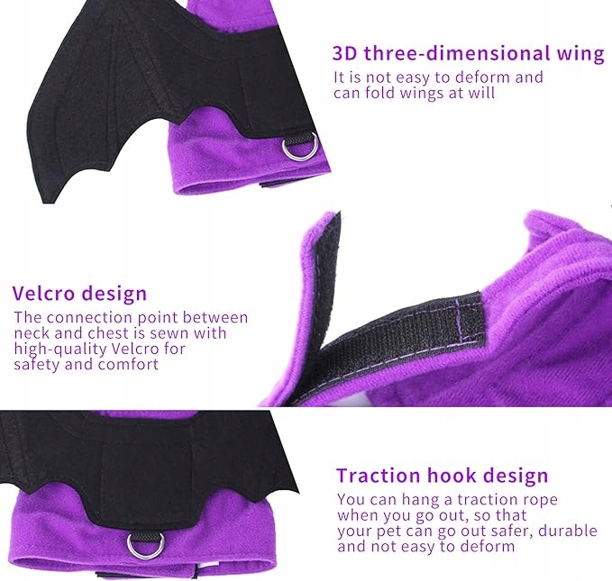- Високоякісні матеріали - костюм кажана для кота і собаки з високоякісного фетру, легкий, міцний і стійкий до розривів, забезпечує приємне відчуття при носінні, не обтяжує домашніх тварин. D-подібне кільце на спині можна легко з’єднати за допомогою мотузки.