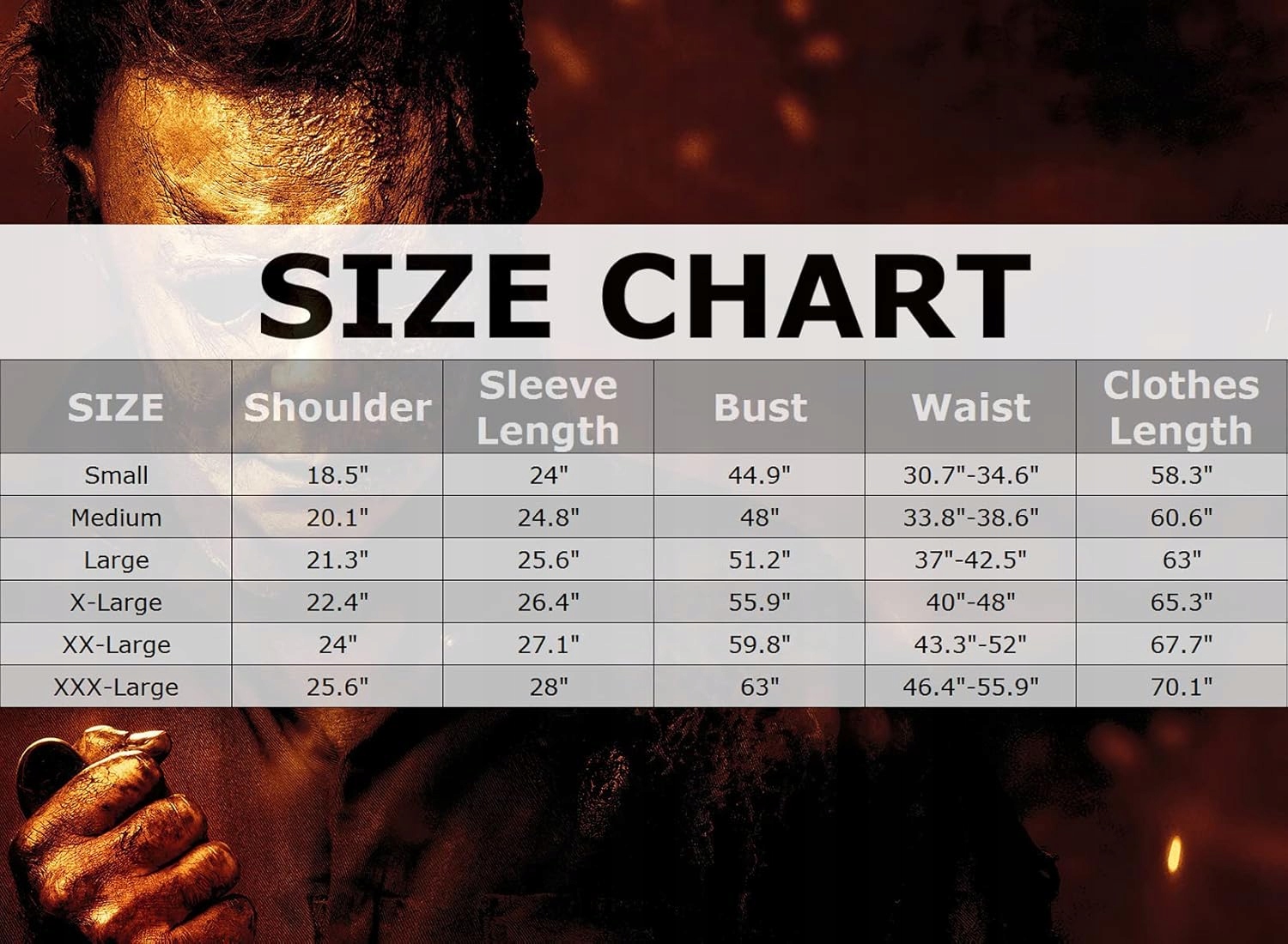 4 4Матеріал костюмів для дорослих: Костюм Майкла Майєрса виготовлений з високоякісного поліестеру, м'якого, дихаючого волокна. Нож Майкла Майєрса виготовлений з пластикових, безпечних та екологічно чистих.