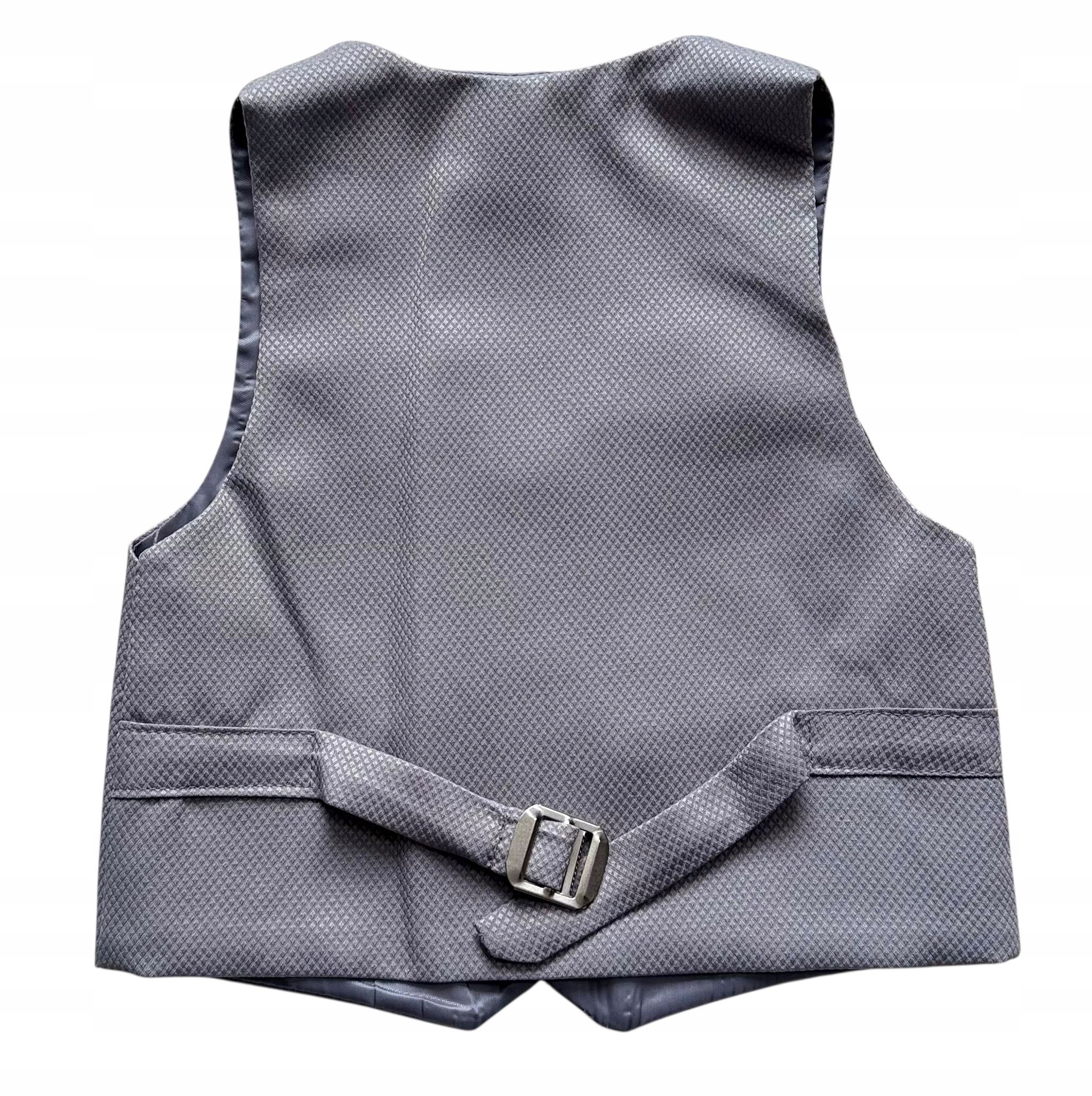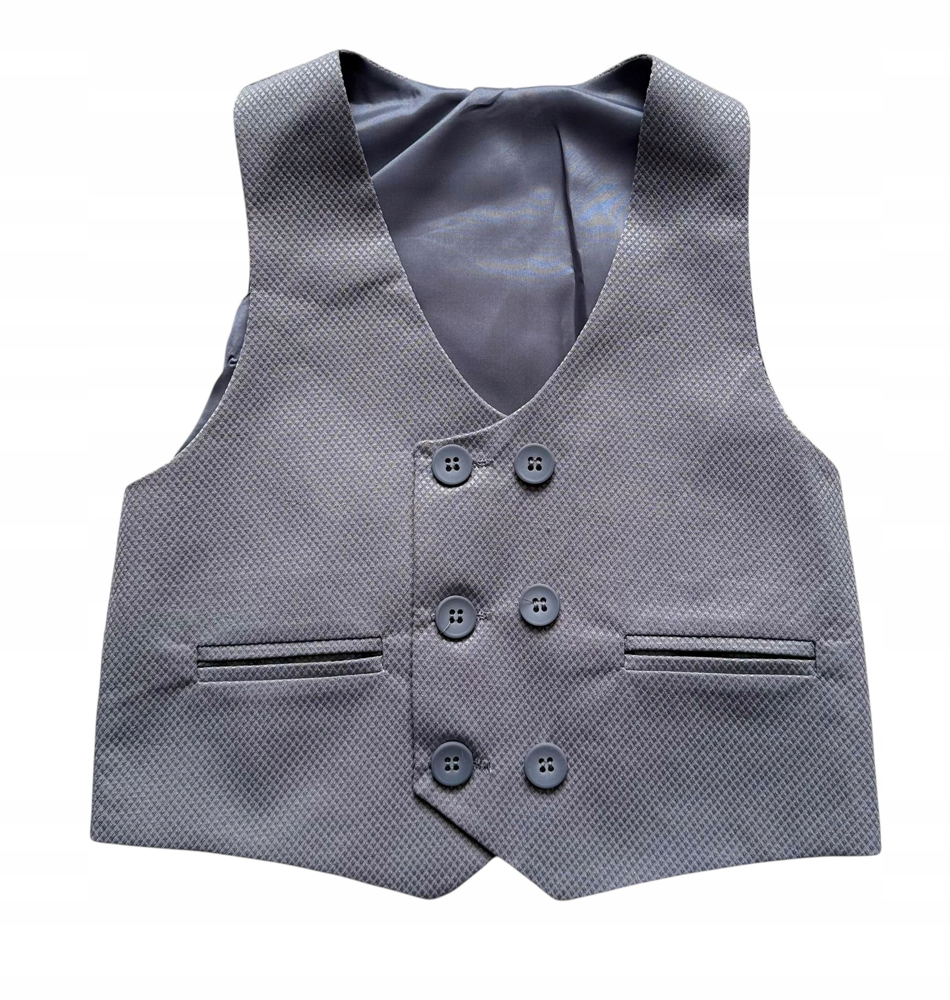 Двобортний жилет застібається на гудзики. Повністю підбитий. Дві фальшиві кишені спереду. Лямка ззаду регулюється.