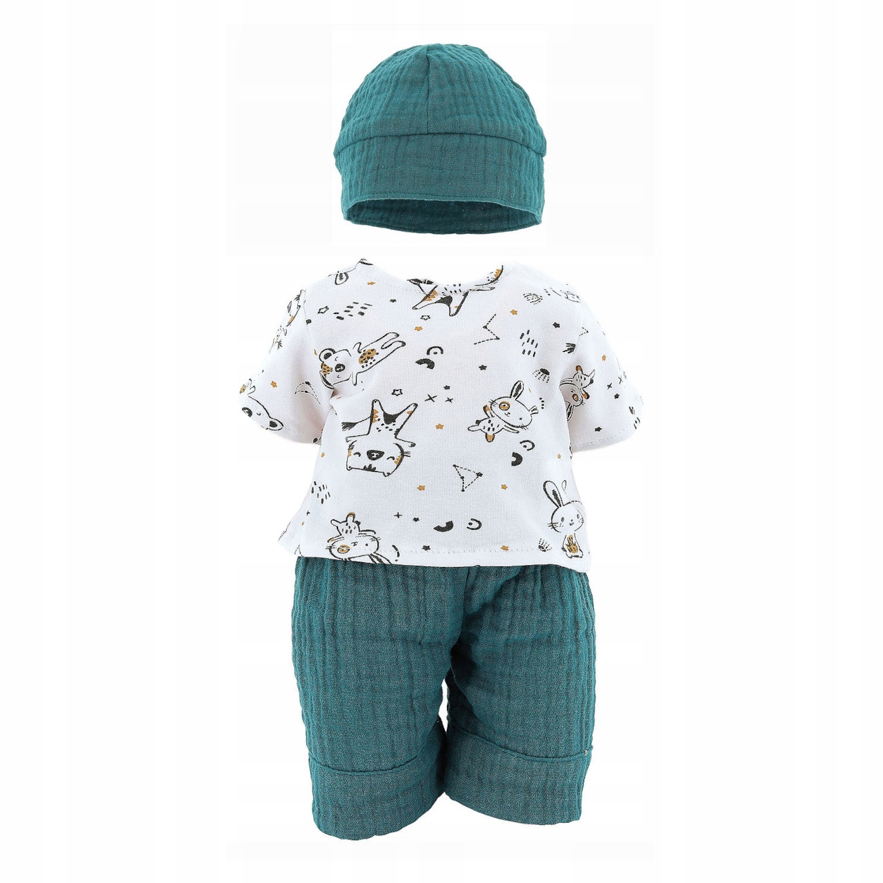 одяг, спеціально розроблений для ляльок Petitcollin від серії Petit Câlin відповідного розміру. Він складається з білої сорочки з друком, короткими синьо-зеленими штанами та шапками одного кольору. Одяг Petitcollin ретельно виготовляється, вони відрізняються французькою елегантністю, унікальними кольорами та візерунками, завдяки яким вони є привабливими та унікальними. Поставляється в паперовому коробці з вікном та пластиковою вішалкою. Основні особливості: для ляльок з висотою 36 см, короткими штанами та капелюхом у Тунісі