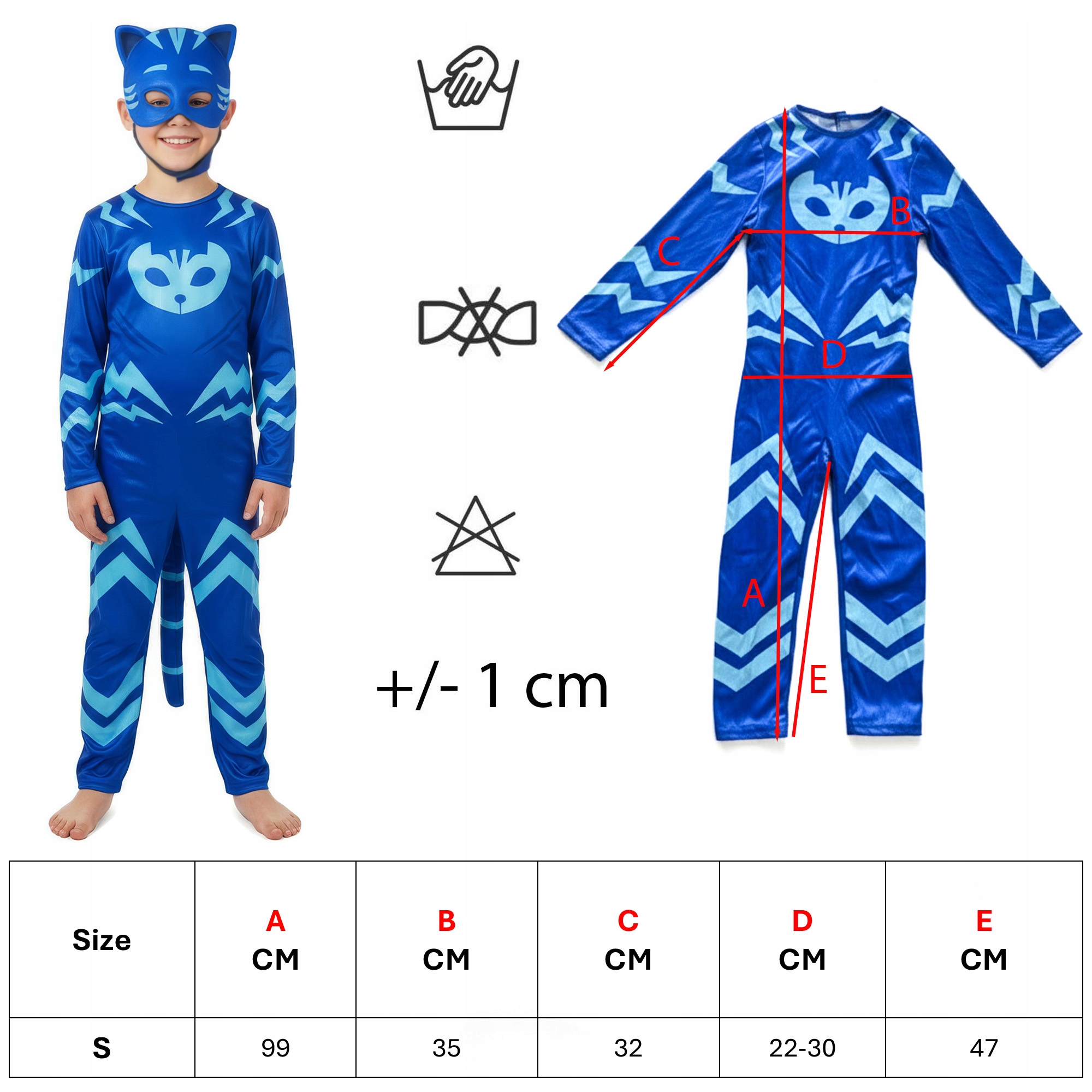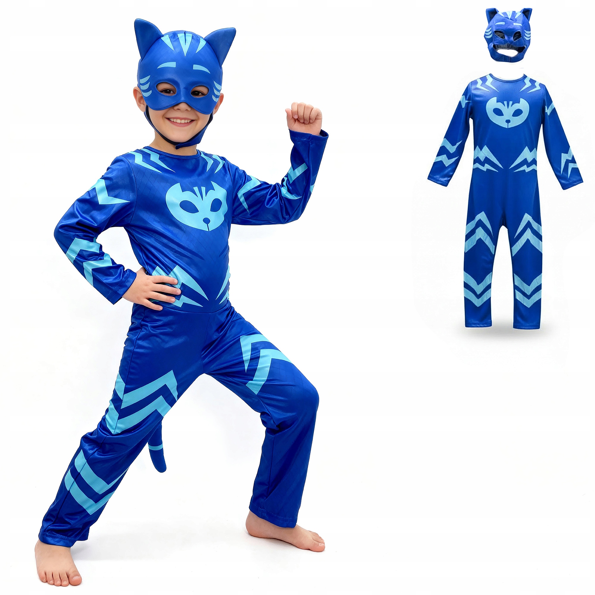 Цей костюм Catboy радує деталями, які справляють враження навіть зблизька - виразні, контрастні принти надають йому ефекту «богатирських обладунків», а злегка блискуча поверхня матеріалу чудово відбиває світло, завдяки чому костюм виглядає ефектно як у русі, так і на сувенірних фотографіях з балу чи дня народження, підкреслюючи динамічний характер персонажа та змушуючи кожну дитину відчути себе справжнім котом-ніндзя, готовим до ночі. місія.
