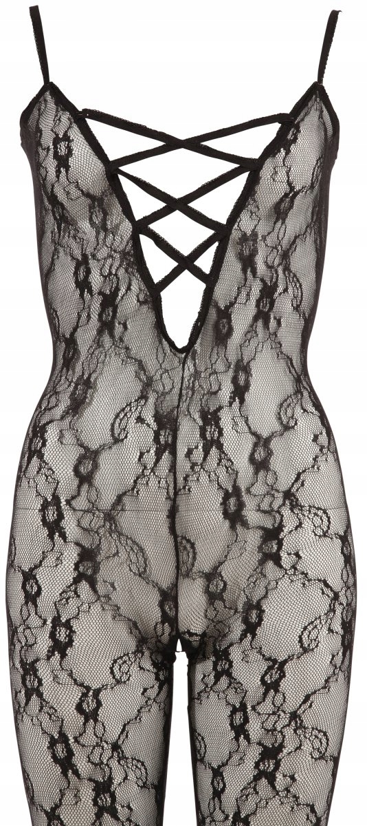 Чорний комбінезон, оздоблений м’яким мереживом у візерунках і глибоким декольте. Відкрита промежину. Покриті ноги. 100% поліамід