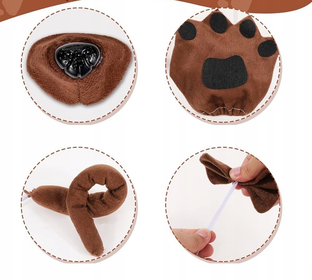 - М'які, коричневі лапи з чорним подушки. Носяться на руках і добре тримаються завдяки еластичній стрічкі на зап'ясті.