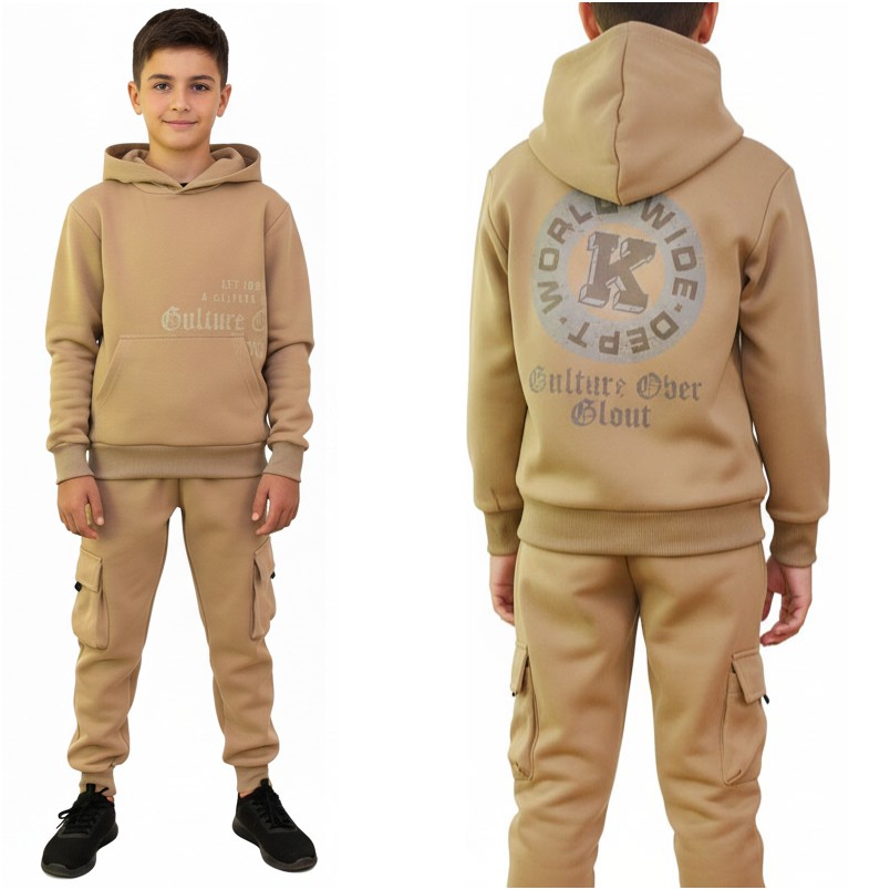 КОСТЮМ СПОРТИВНИЙ ДЛЯ ХЛОПЧИКА БЕЖЕВИЙ ОСІННІЙ: ТОЛСТОВКА З КАПЮШОНОМ І ШТАНИ-КАРГО, РОЗМІР