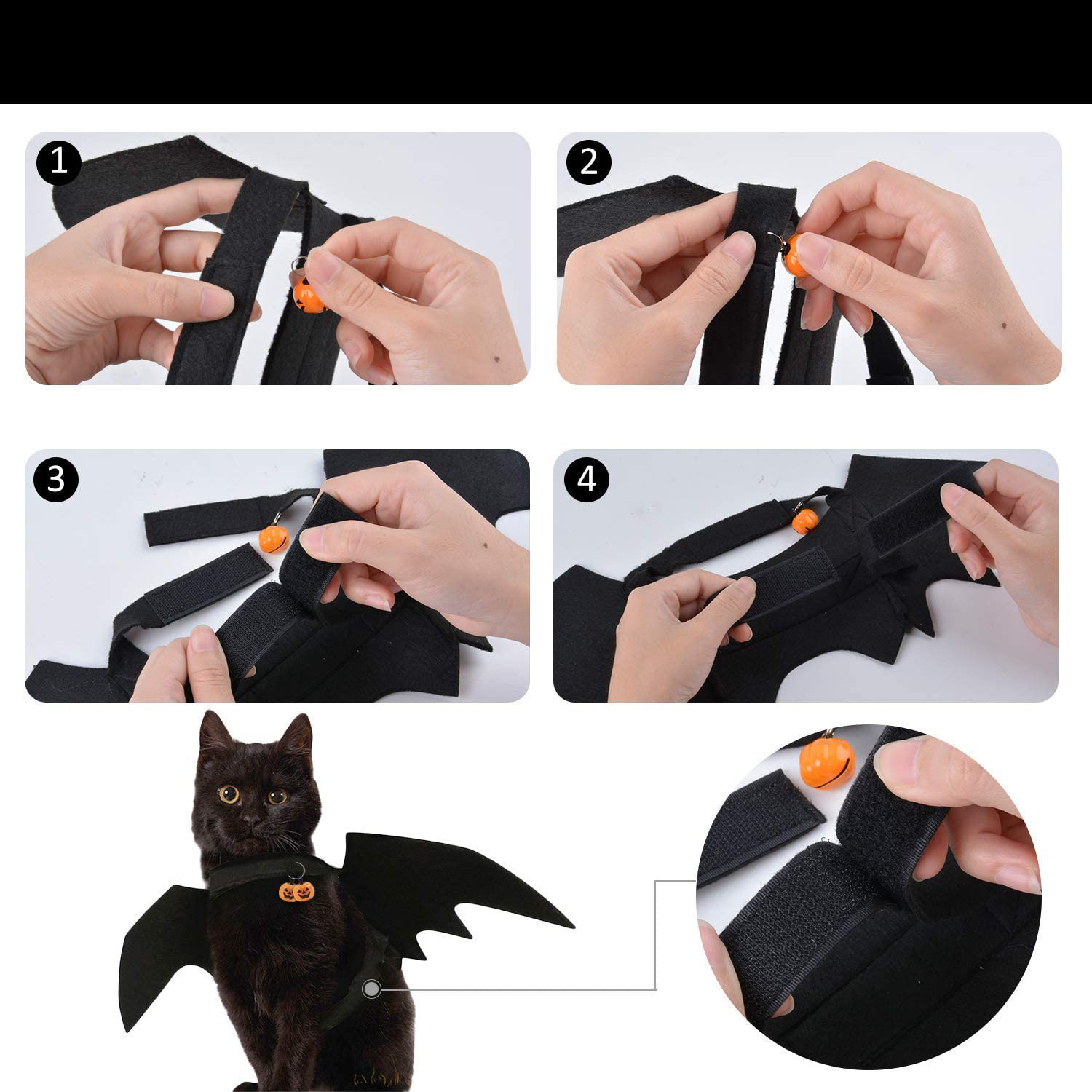 - Висока якість: Матеріал -це тканина з чорної фетри, безпечна та нетоксична, екологічно чиста та довговічна. Хеллоуїн гарбуз, легкий і не змушує кота відчувати себе в пастці. Носіння та видалення. Поміркованість може бути вільно регульована для задоволення вимог вашого вихованця, щоб це було приємним і модним. 4 Кріплення на липучках забезпечує навіть розташування, щоб уникнути падінь під час ходьби чи бігу. Завдяки 2 гарбузам на Хеллоуїн ви можете почути звук і забезпечити своїй кішці безпеку в аварійних ситуаціях, він легкий і практичний. 4 4 Коли ваша кішка носить крила кажана, це стає крутим і загадковим.