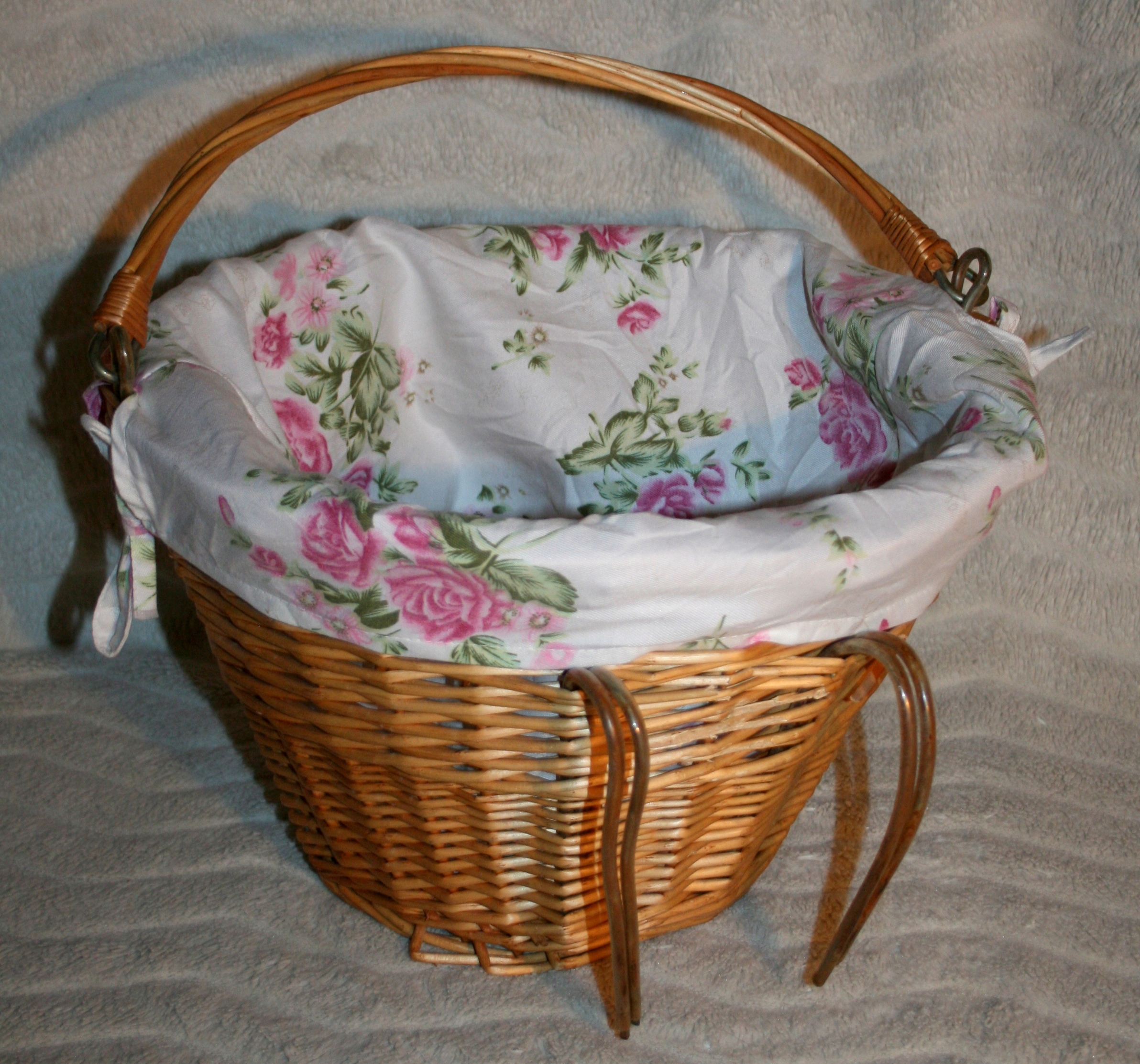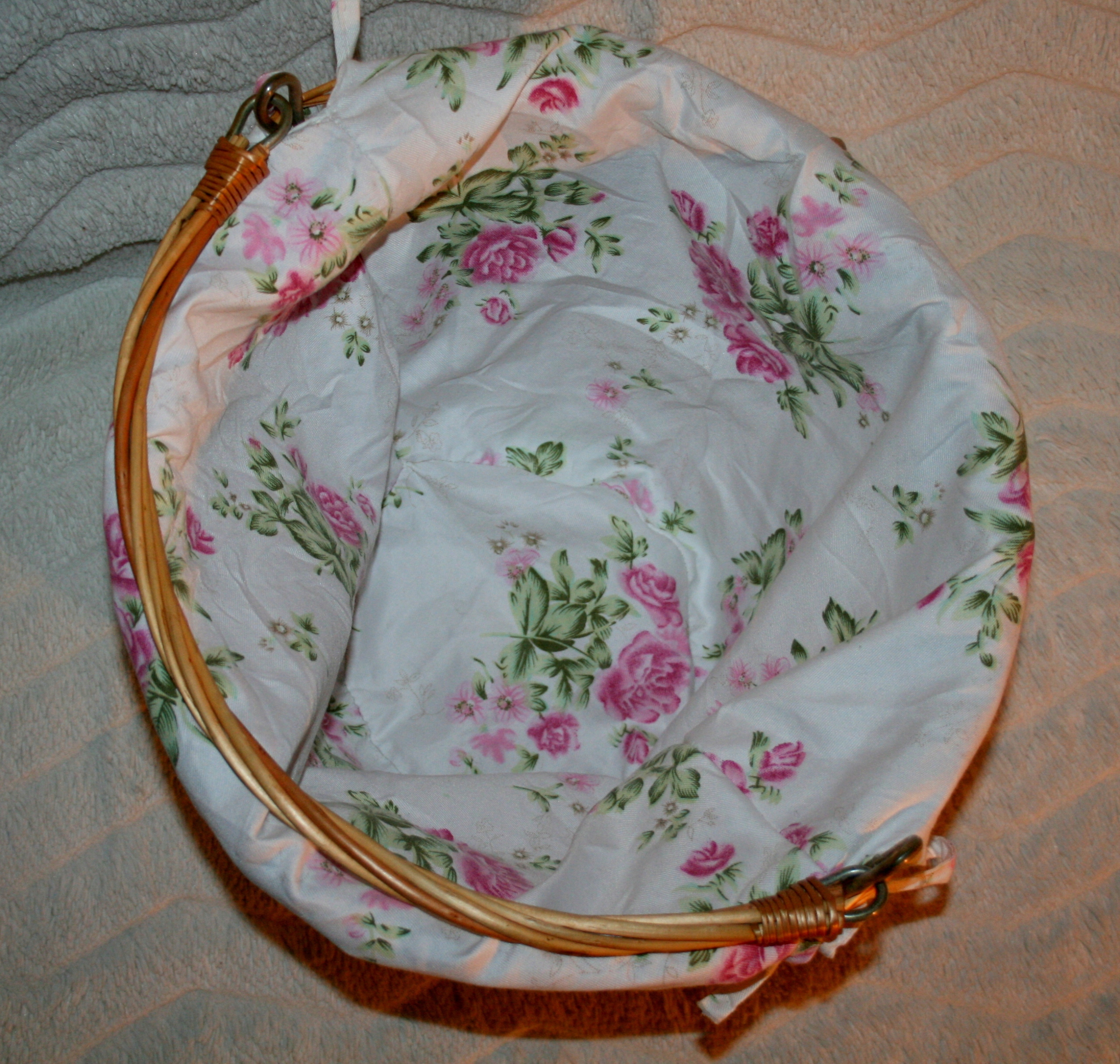 Чудова майстерність із плетеної мідної лози , додатково зсередини кошик обшитий білим матеріалом з квітковим мотивом, який можна зняти та мити.