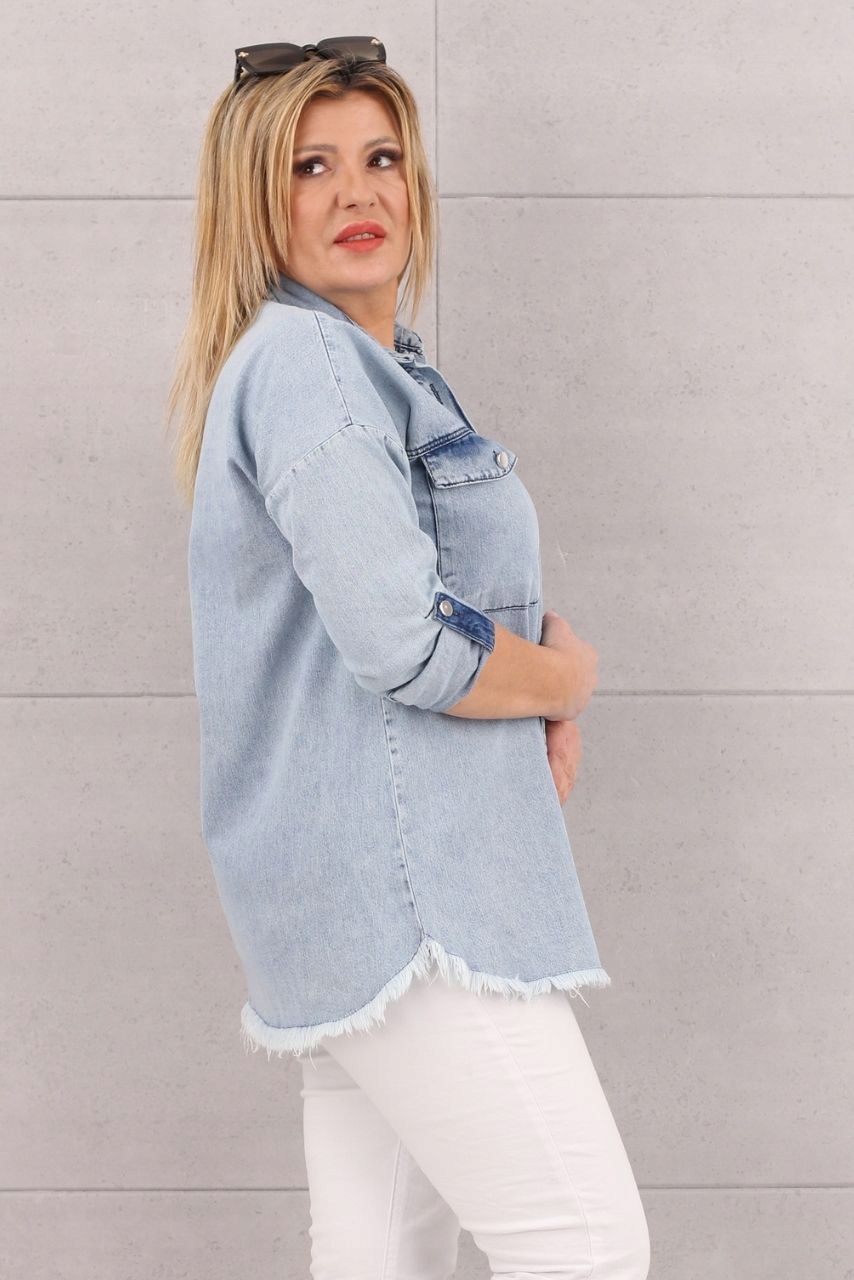 Виготовлена з високоякісного деніму, ця класична сорочка привертає увагу своїм надзвичайним шармом і універсальністю. Його можна носити трьома способами - як туніку, сорочку на ґудзиках або легкий верхній одяг. Ця універсальність робить його чудовим елементом гардеробу, який можна адаптувати до різних стилів і часу. Матеріал у нижній частині модно потертий, додаючи характеру та стилю.