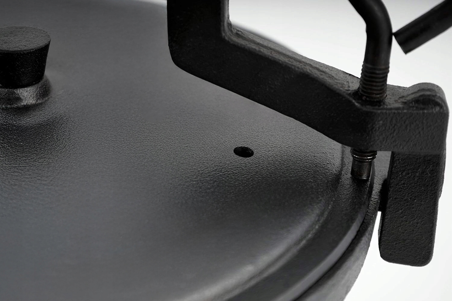 Кришка казана має спеціальний різьбовий механізм, який дозволяє щільно закривати казан, захищаючи від протікання та покращуючи якість тушкованих страв.