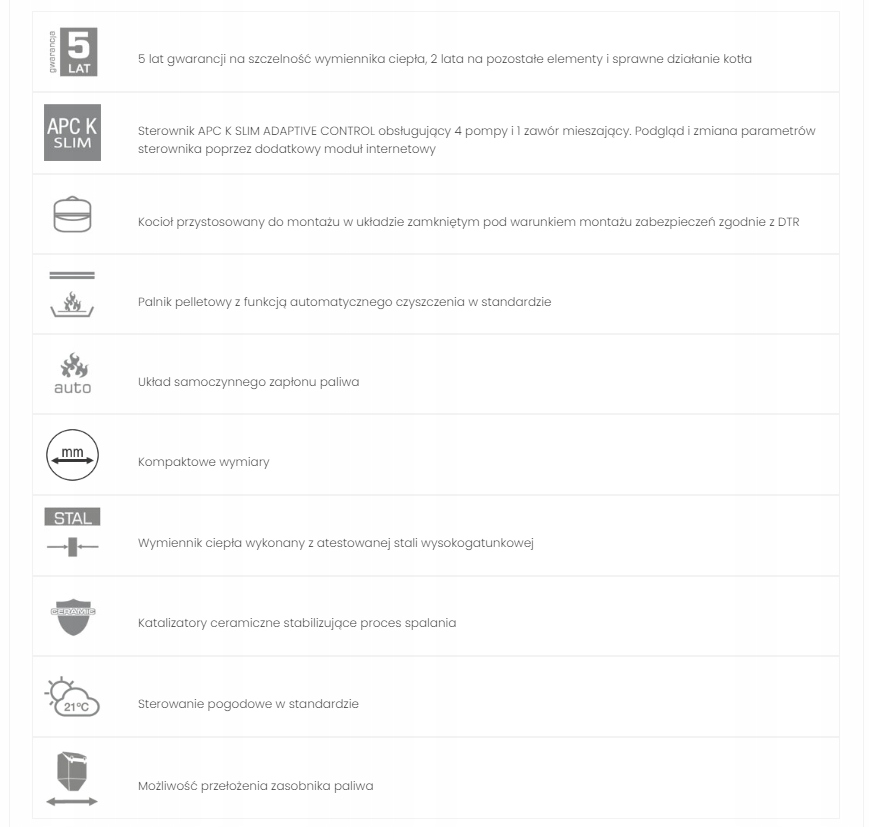 - 5 років гарантії на герметичність теплообмінника, 2 роки на інші елементи та ефективну роботу котла.