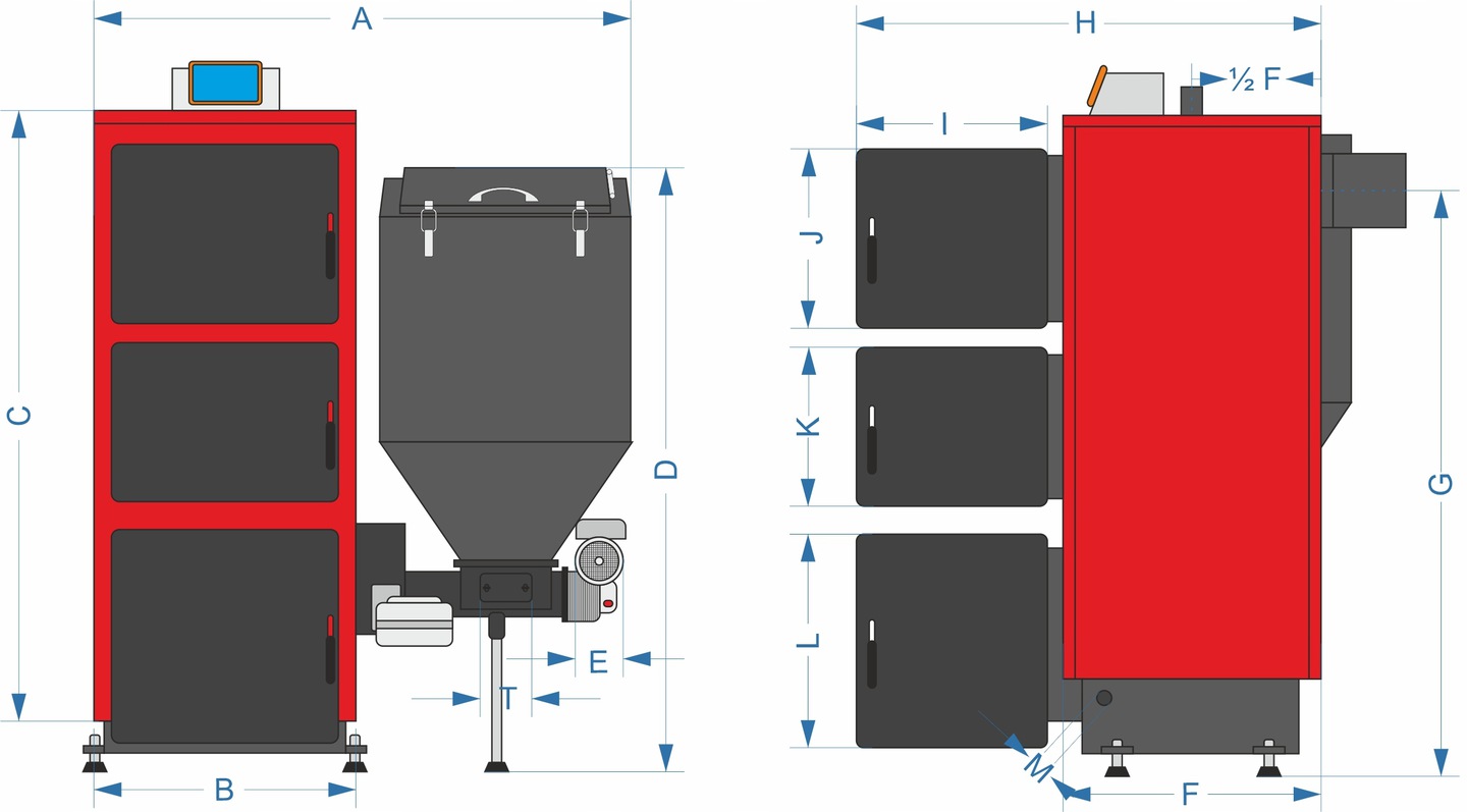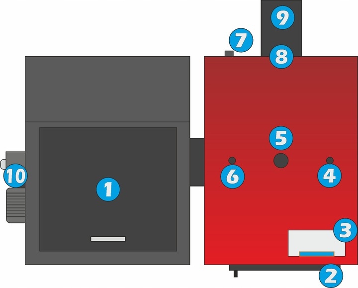 1. Завантажувальний бункер об'ємом до 160 літрів (може бути розміщений праворуч або ліворуч від котла)