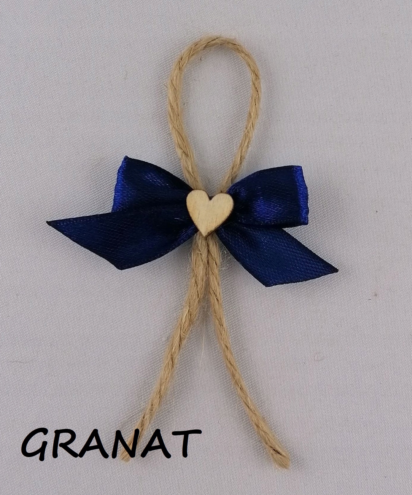 - Шпилька складається з атласної банти, прикріпленої до джутової нитки та прикрашеної дерев’яною стрічкою сердечко