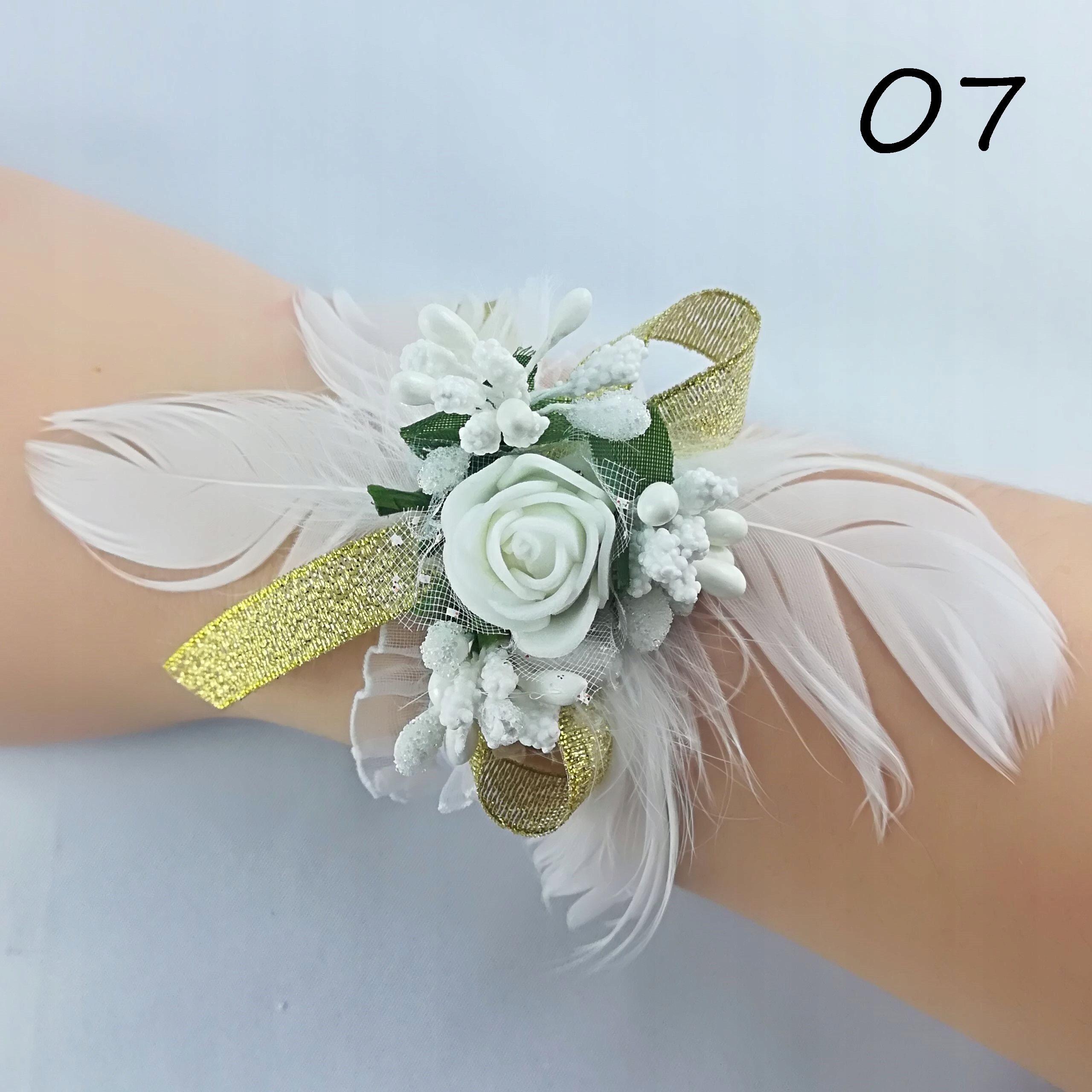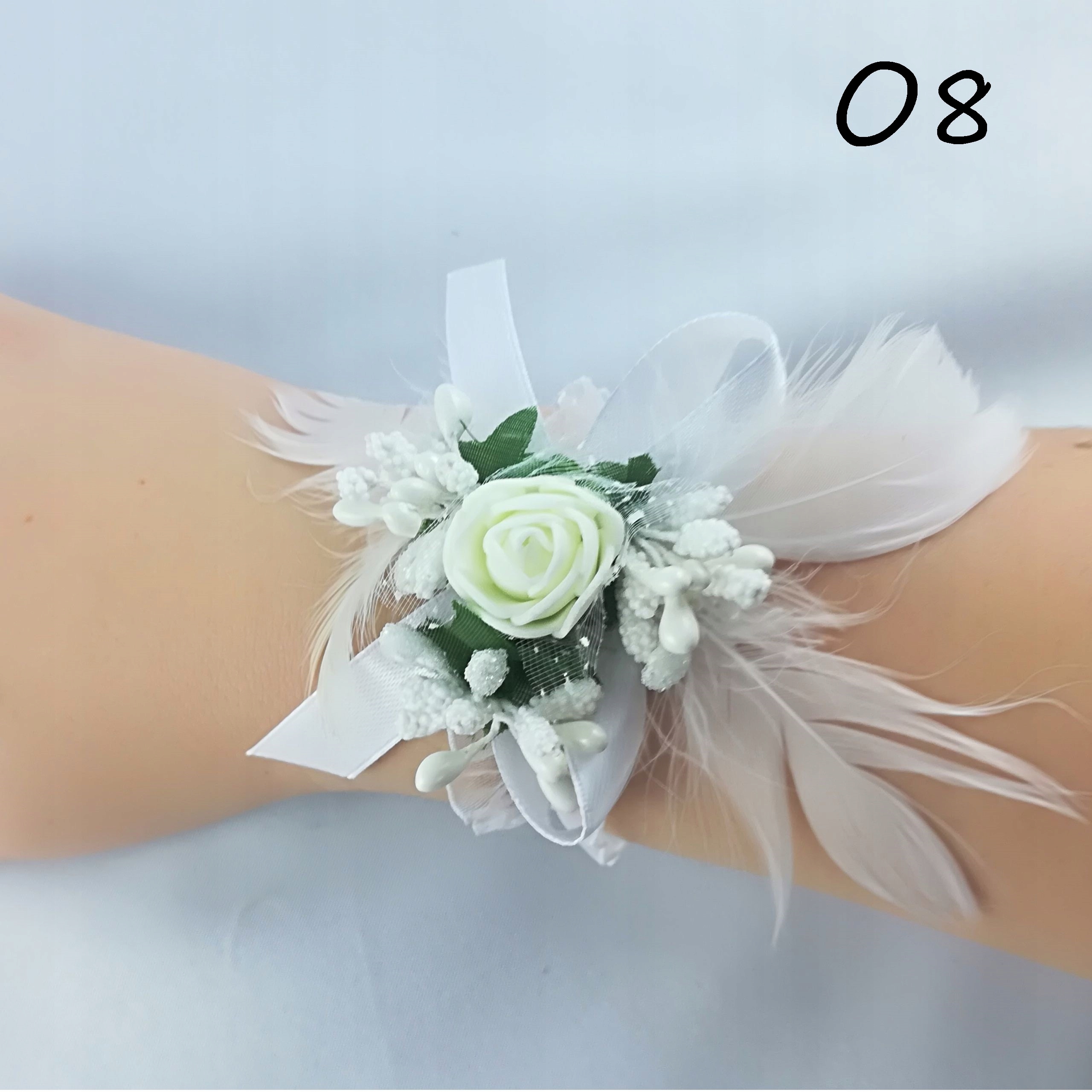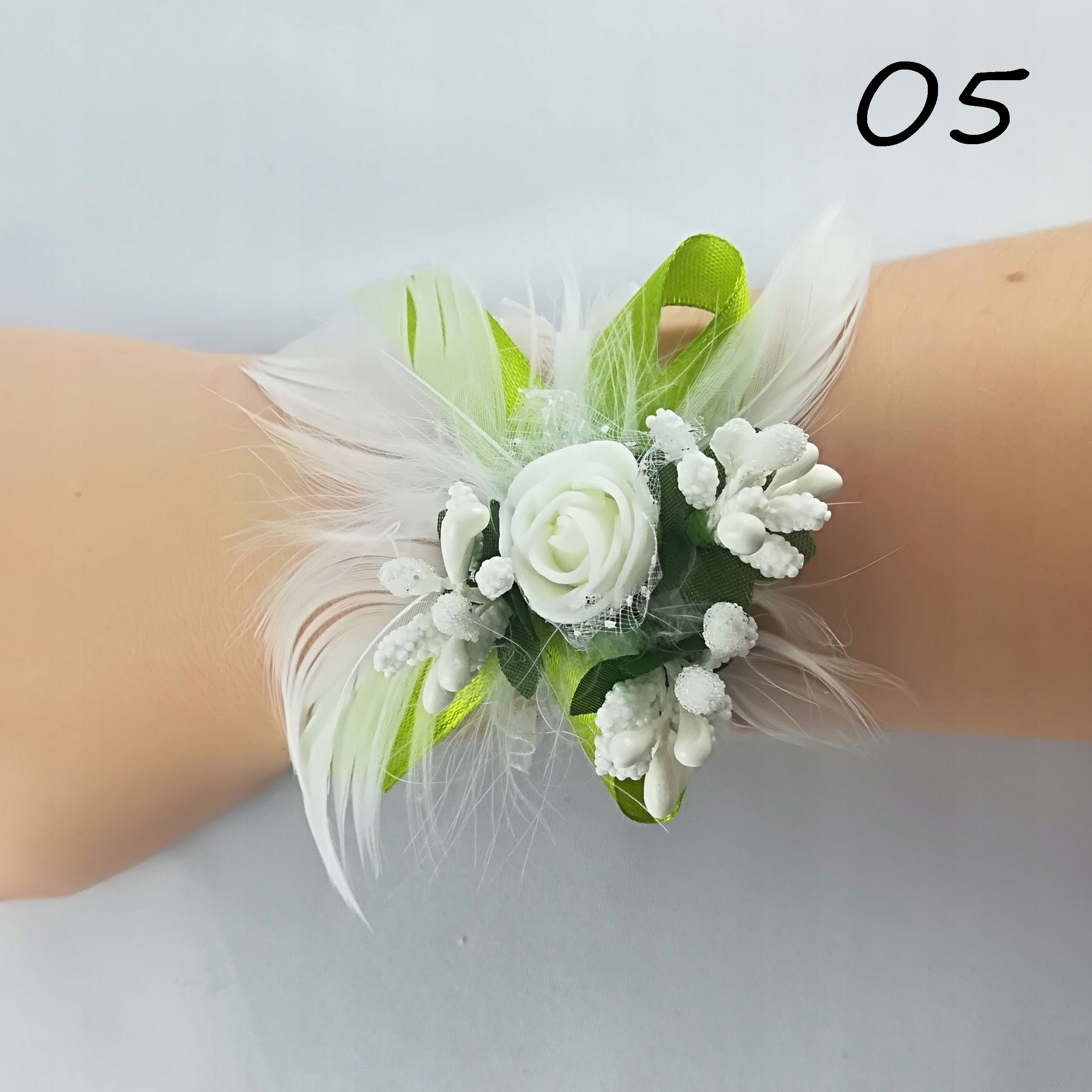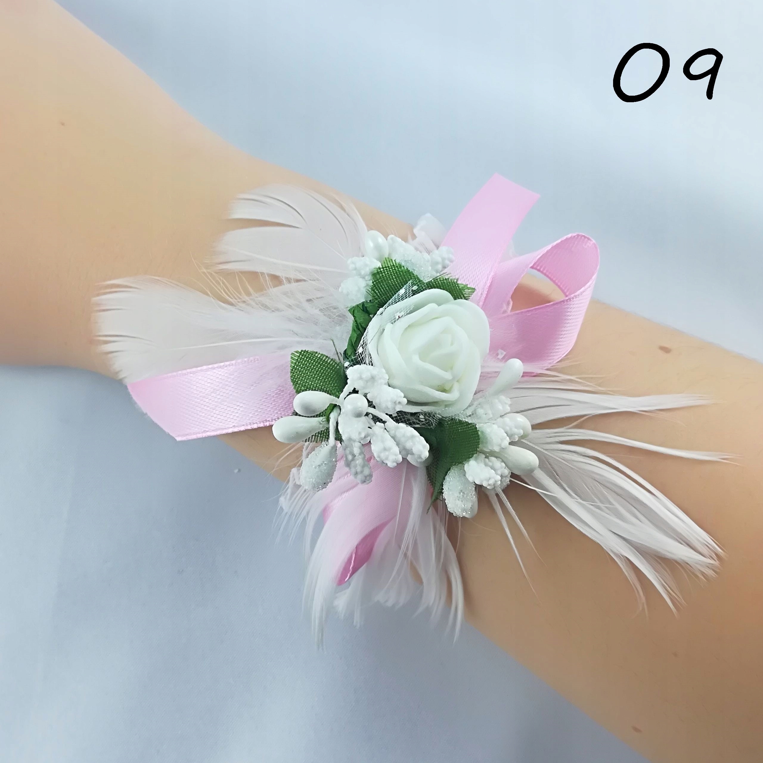 Прикраса виготовлена з пінопластової квітки, трьох декоративних рис, пір’я та луків із стрічки шириною 1 см. Все прикріплено до гумокорону, ідеально адаптуючись до вашої руки.