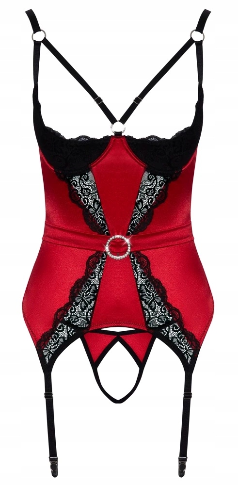 атлас і мереживо в еротичному поєднанні кольорів! Haleczka встановлена з підв'язкою без грудей і ремінців без промежини коттелної білизни. виготовлений з червоного шовковистого гнучкого атласу, прикрашеного ніжним мереживом та контрастними деталями чорного кольору.