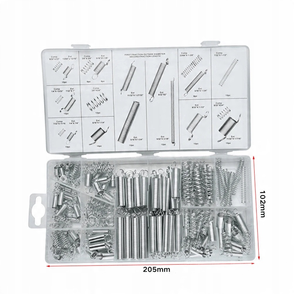 Включає пластиковий футляр із таблицею розмірів на кришці, щоб упорядкувати свої пружини наступного разу.